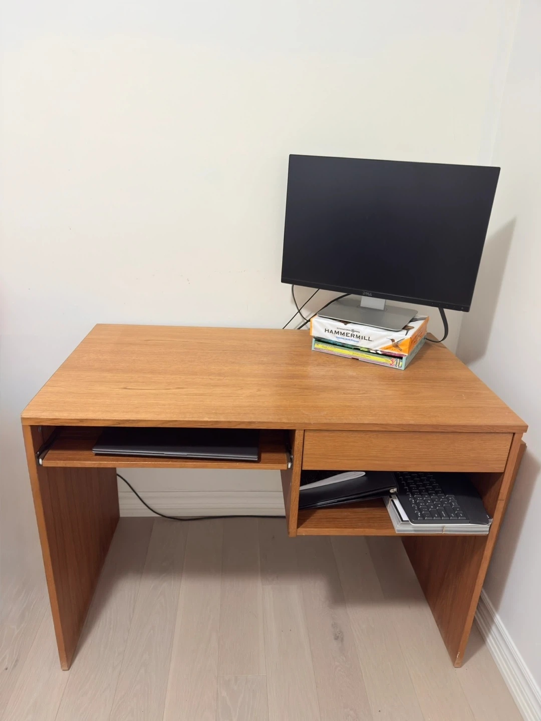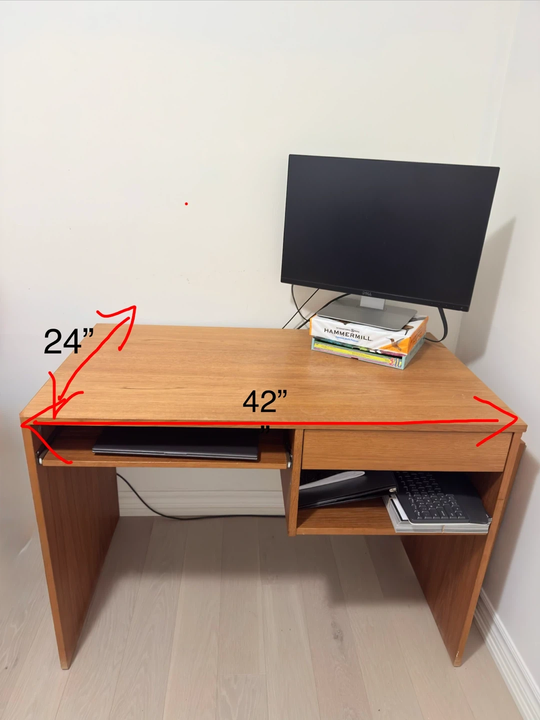 This wooden computer desk measures 42 inches by 24 inches. It includes a pull-out keyboard tray and a drawer for storage. Perfect for a home office setup. It's got a nice mid-century modern look!