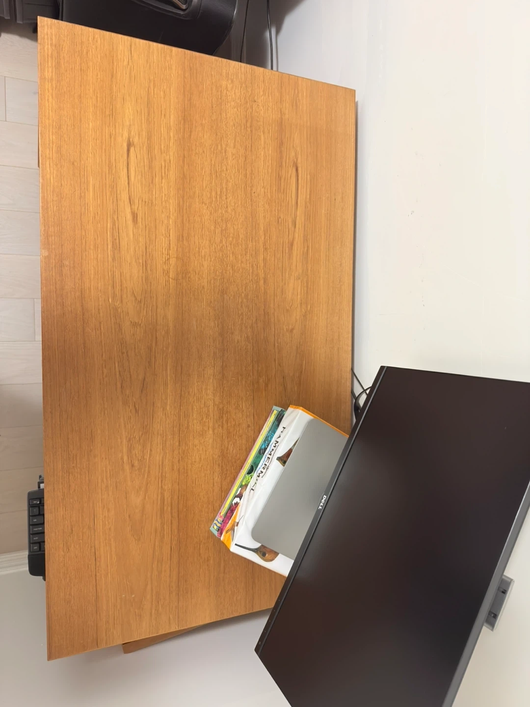 This wooden computer desk measures 42 inches by 24 inches. It includes a pull-out keyboard tray and a drawer for storage. Perfect for a home office setup. It's got a nice mid-century modern look!