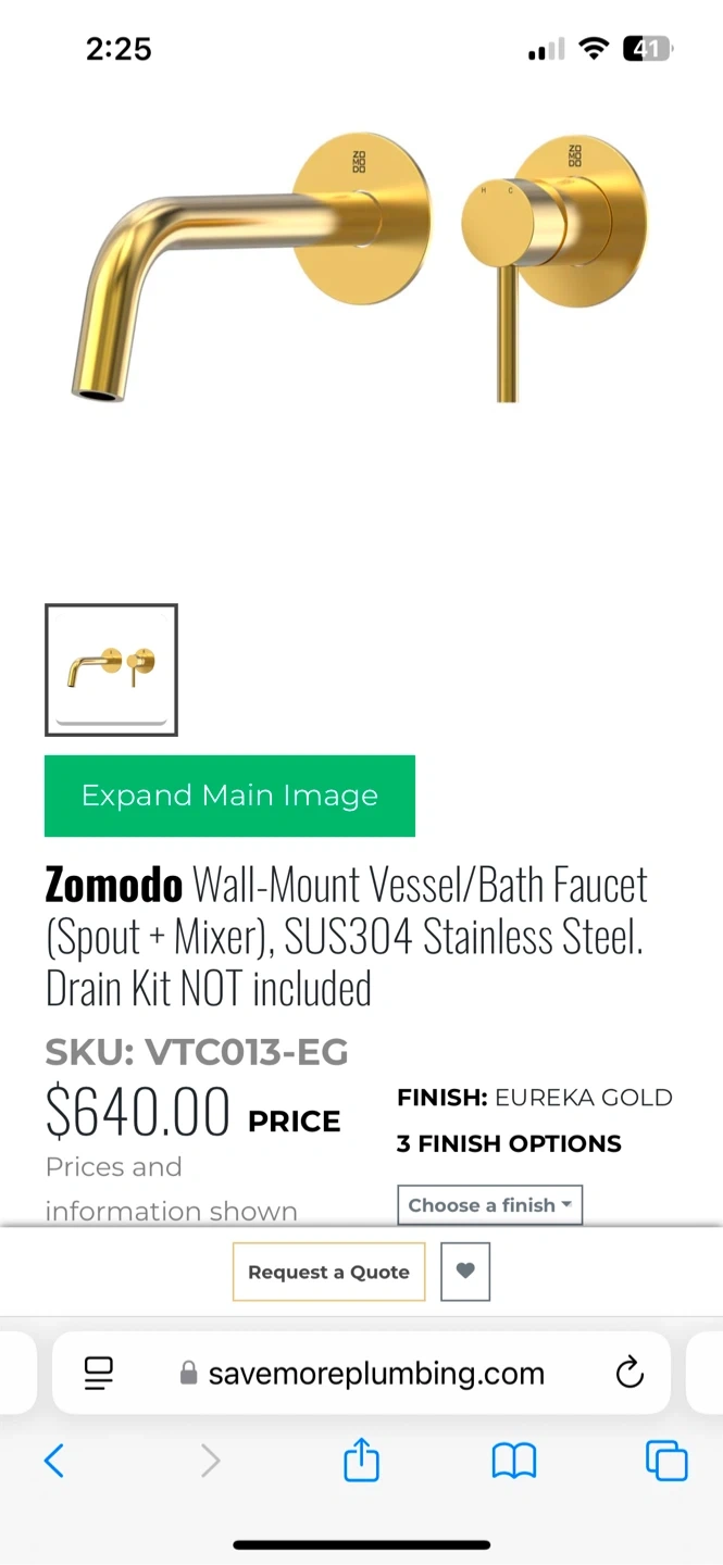 This is a Zomodo Wall-Mount Vessel/Bath Faucet in Eureka Gold. It's made from SUS304 Stainless Steel. The reach is 8 3/8". This faucet would be useful for a modern bathroom renovation.