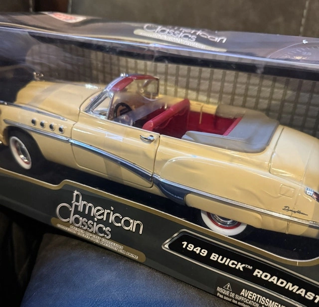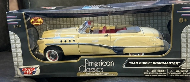 Behold this Motor Max American Classics 1949 Buick Roadmaster diecast model car, a beautiful recreation in 1:18 scale. This item is brand new, encased in its original packaging with slight damage -ready to be the crown jewel of your collection or a distinguished gift for the classic car aficionado in your life. Here are some details:
