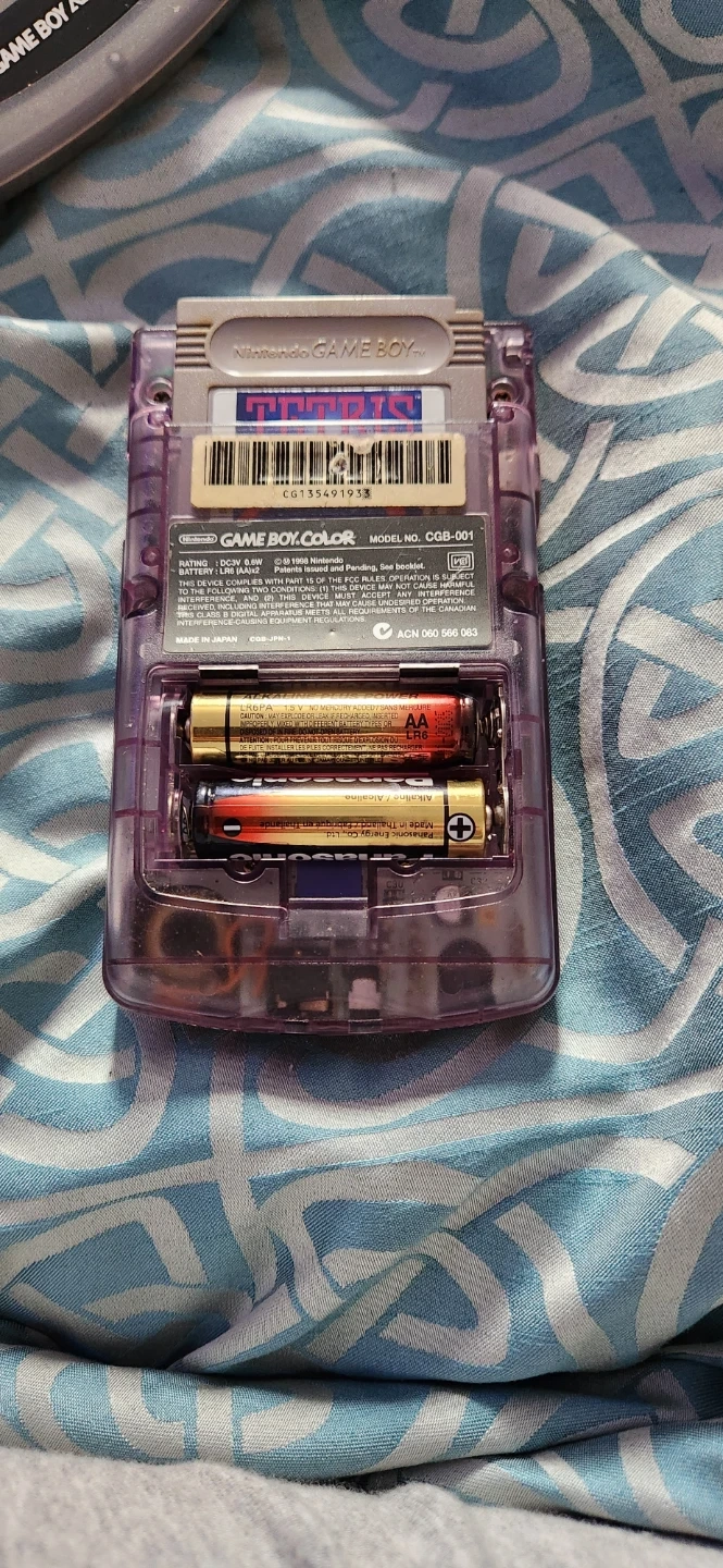 This is a purple Nintendo Game Boy Color. It's a classic handheld gaming device. It runs on AA batteries and plays original Game Boy Color cartridges. Does not have battery cover