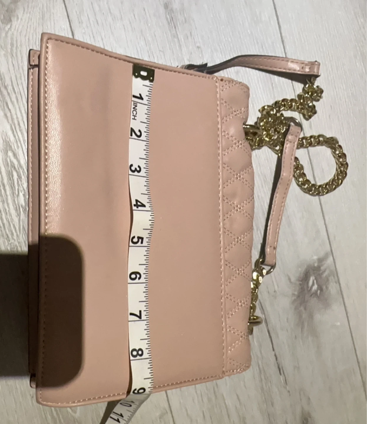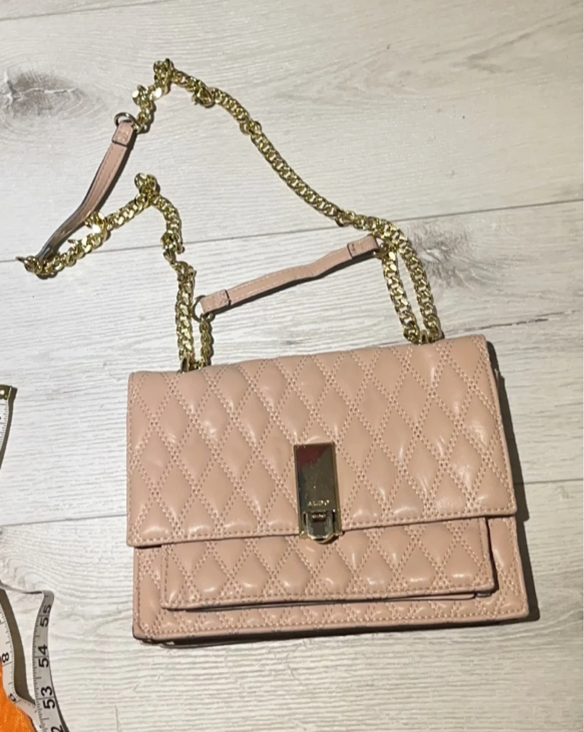 Chic ALDO shoulder bag in a pretty blush pink colour. It's made of quilted faux leather with a gold chain strap and a gold clasp closure. Dimensions: approximately 9 inches wide by 5 inches high.