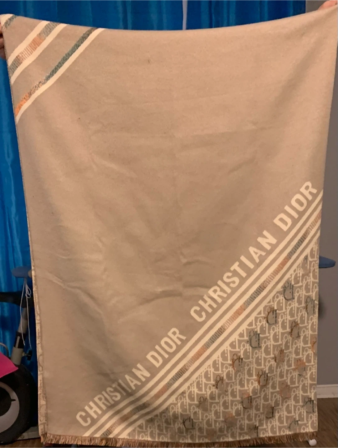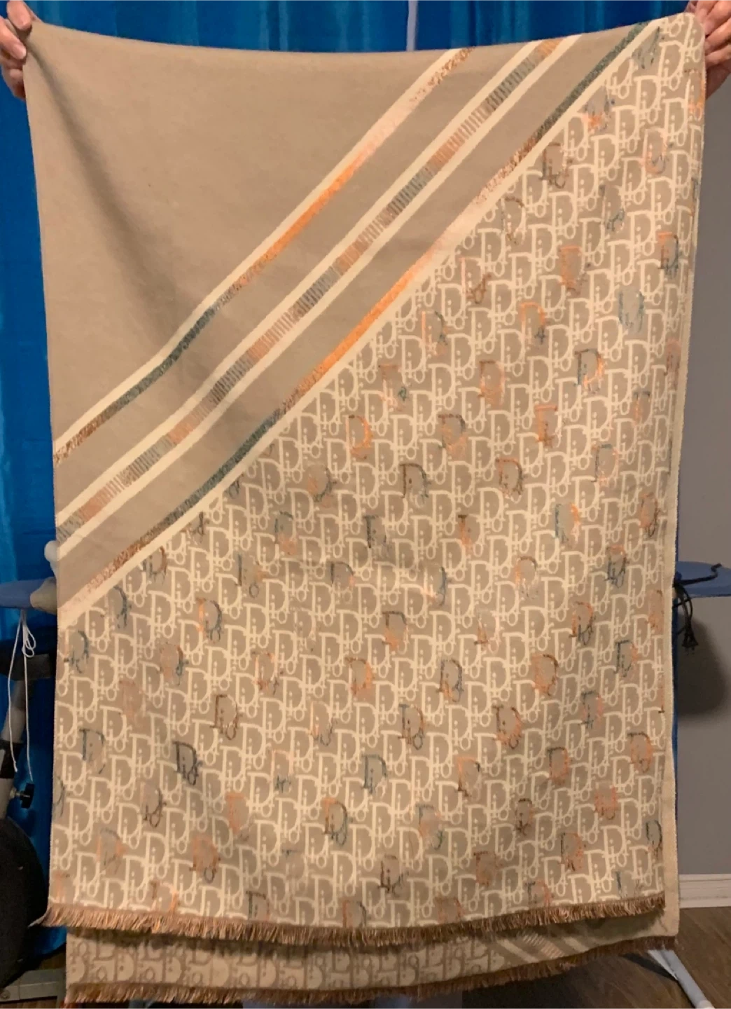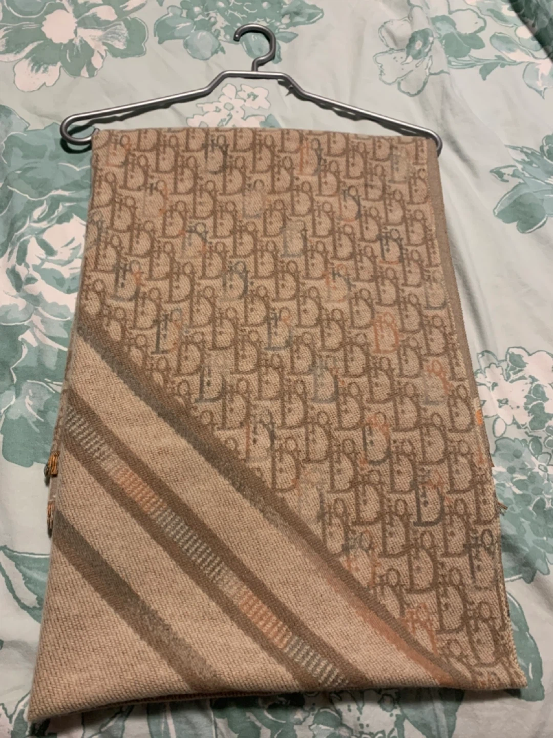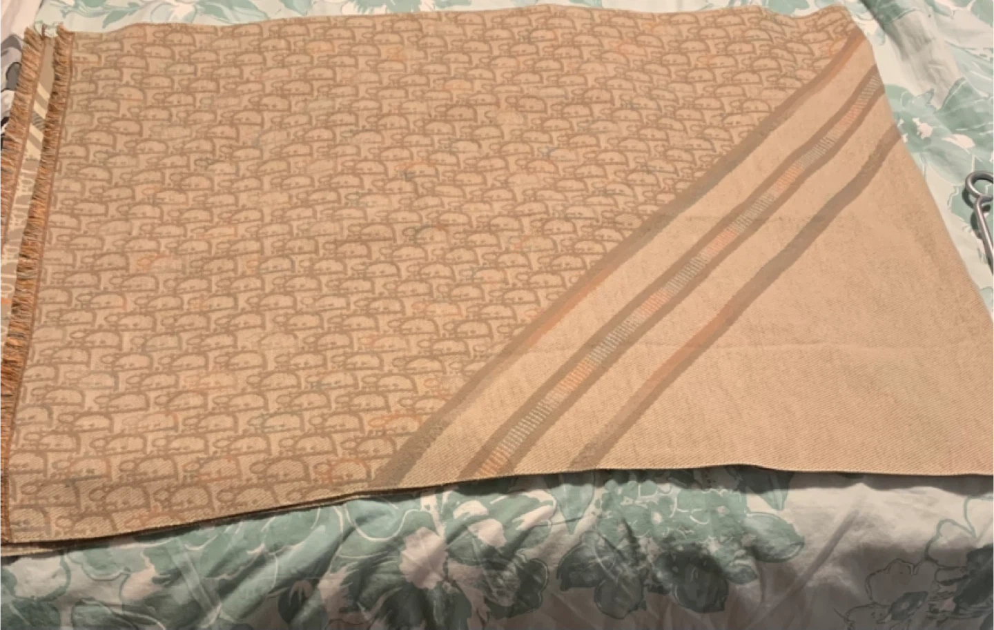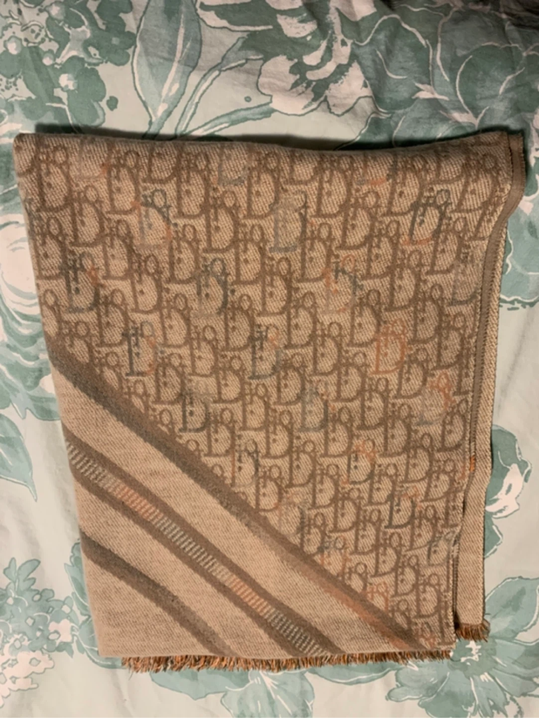 A scarf featuring the iconic monogram pattern. It has striped accents along one edge. Crafted from a soft material, it's perfect for adding a touch of luxury to any outfit.