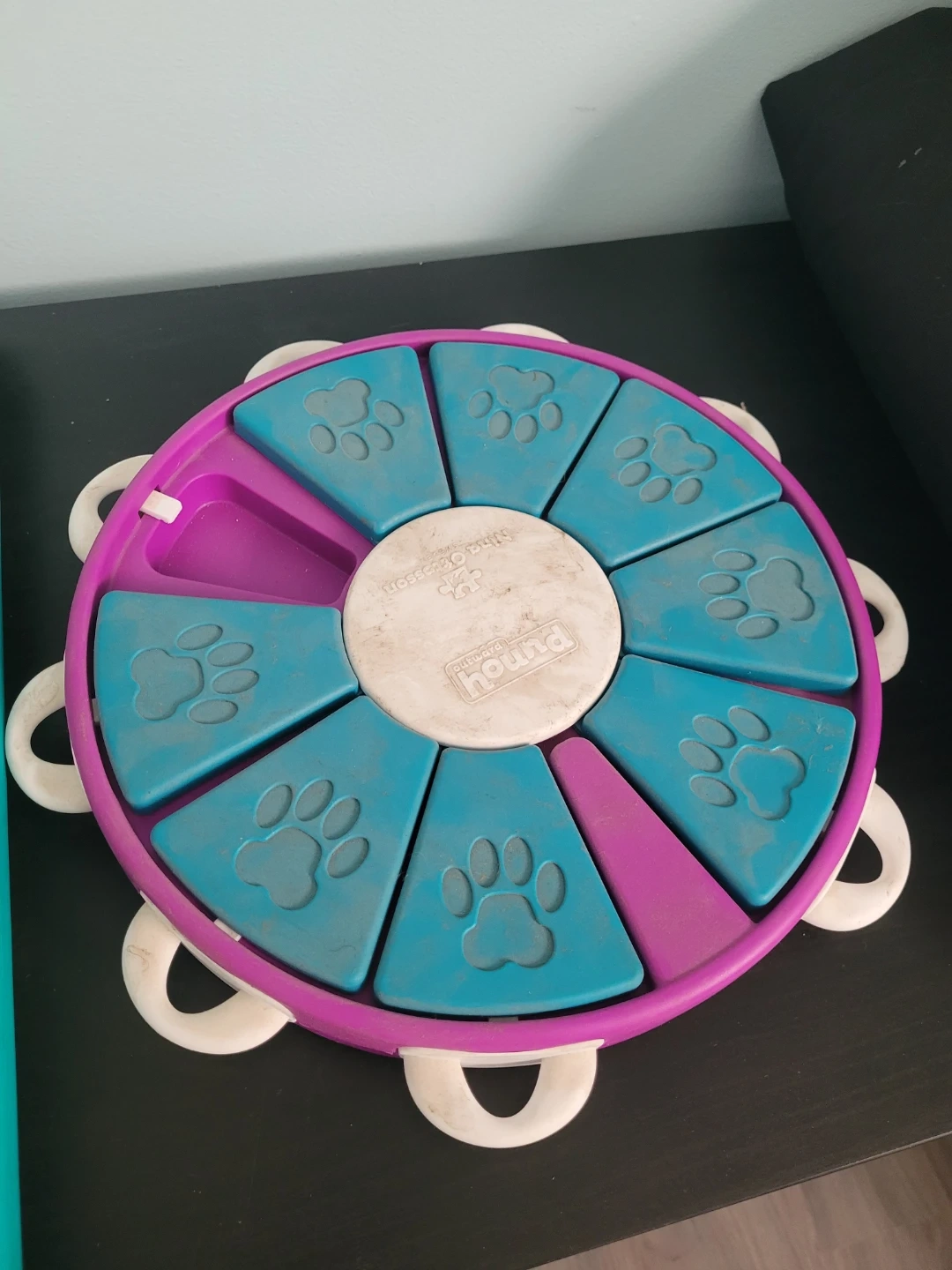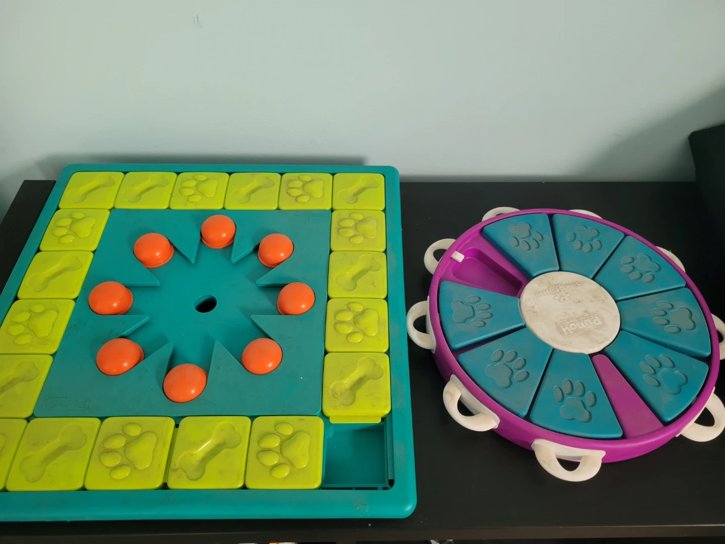 Interactive dog puzzles designed for mental stimulation. Features sliding compartments and flip-top pieces to hide treats. Helps keep your dog engaged and entertained!