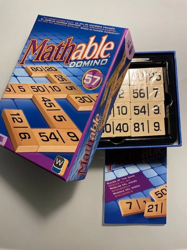 Mix between Mathable and Dominoes. Domino tiles may be placed next to the domino placed in the middle of the table to complete any equation (+, -, x, ÷) so that one of the two numbers on the domino placed is the result of the equation formed by the two adjacent numbers, regardless if the two numbers of the equation are from the same domino or two different dominoes.