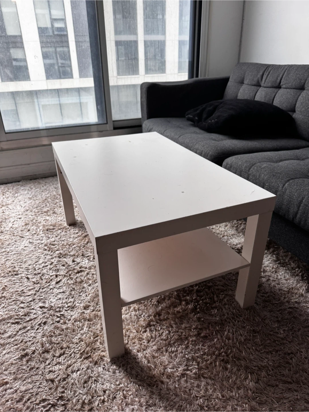 White coffee table featuring a lower shelf for extra storage. It's a simple, functional piece for your living room. Dimensions are approximately 47" L x 23" W x 18" H. Particleboard construction. Ikea coffee table white has a little scratch. Apart from that it’s in good condition