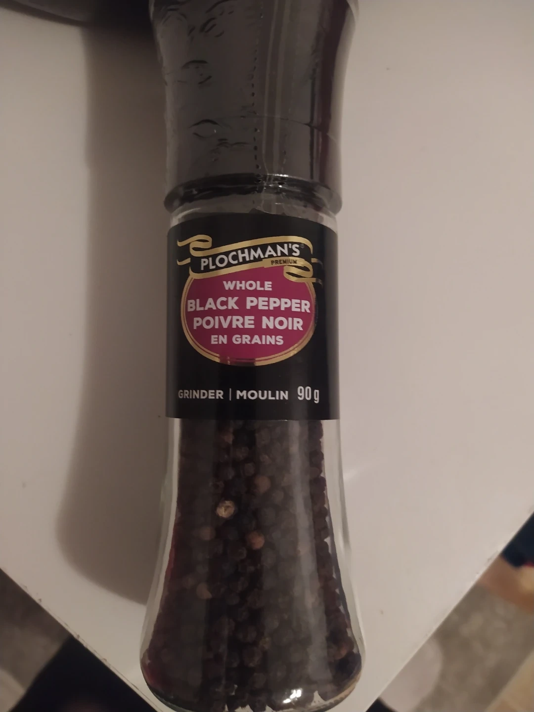 Plochman's Premium whole black pepper grinder. Contains 90g of peppercorns in a glass grinder. Easy to use for seasoning.