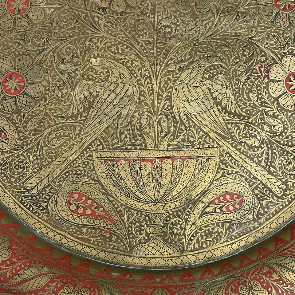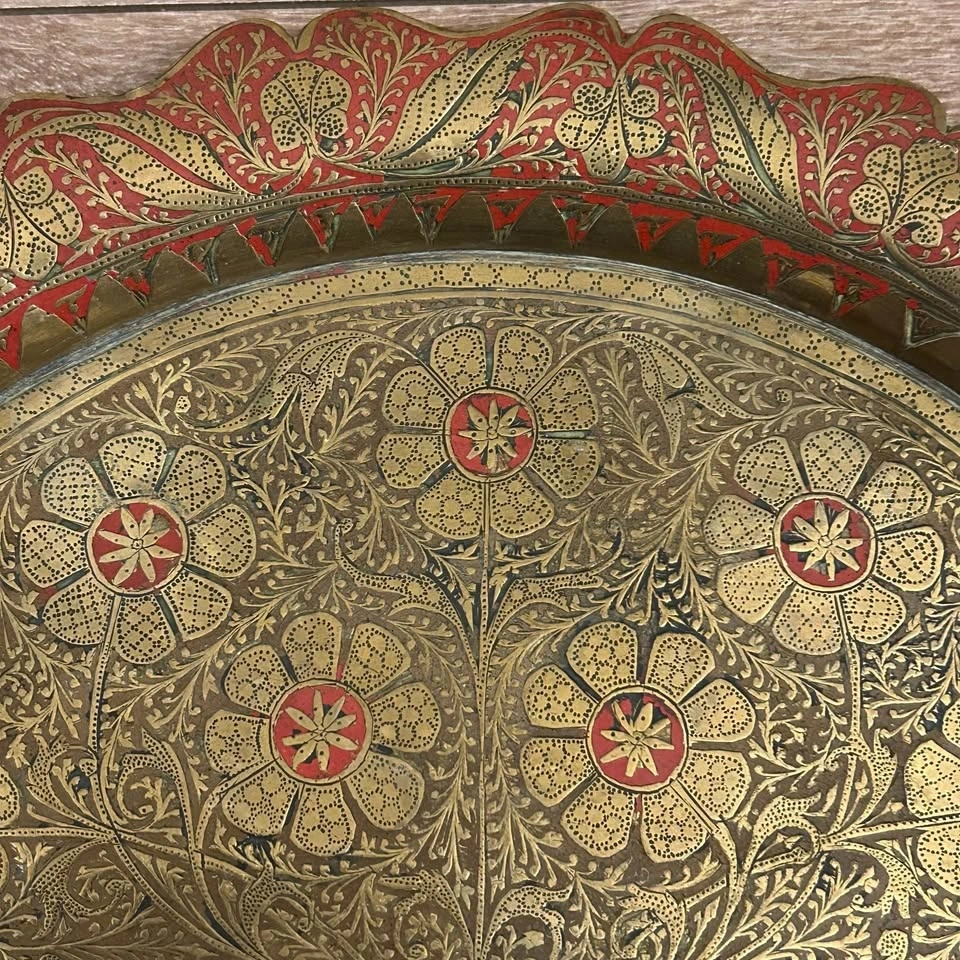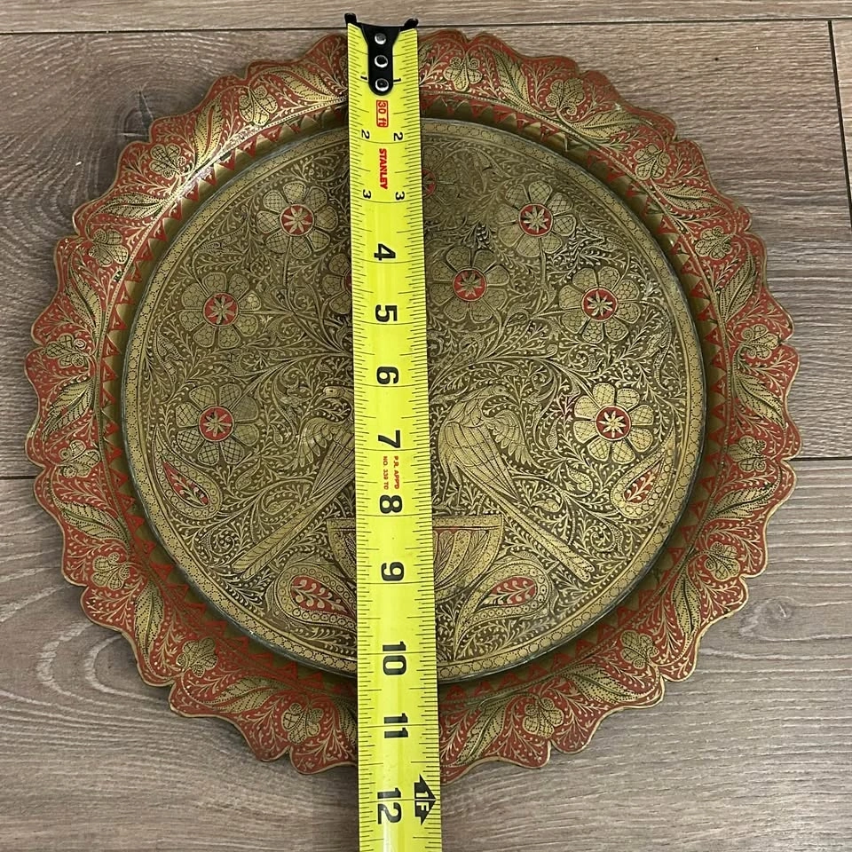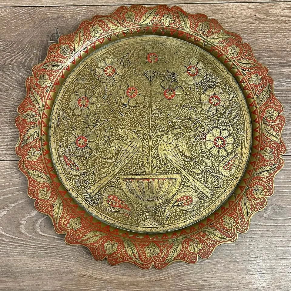 Beautiful vintage solid brass tray or wall plaque featuring hand-etched Indo-Persian-inspired artistry. The centerpiece depicts two elegant peacocks flanking a floral urn, surrounded by intricate scrolling vines and accented with vibrant red enamel details. The decorative scalloped “pie crust” rim enhances its ornate appeal, while the heavy solid brass construction ensures durability and presence. The reverse displays a warm, natural patina, while the front remains bright with only minor wear consistent with age. Versatile for display: can be used as a decorative serving tray, coffee table centerpiece, or mounted on the wall (requires a plate hanger). An ideal statement piece for Bohemian, Eclectic, or Mid-Century inspired interiors. Pick up in the Seton area, Calgary. Cash and e-transfers accepted. Please take a close look at the photos as these are not new items. Feel free to message if you have any questions!