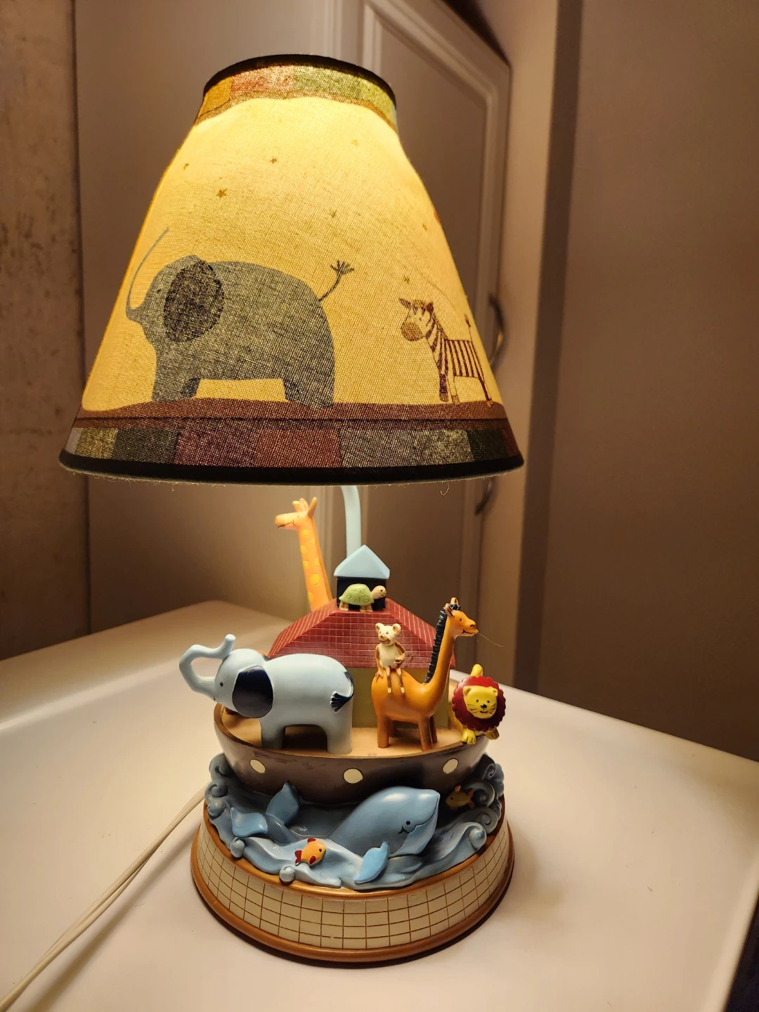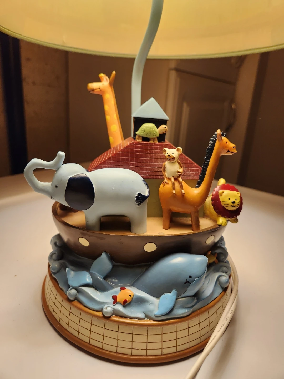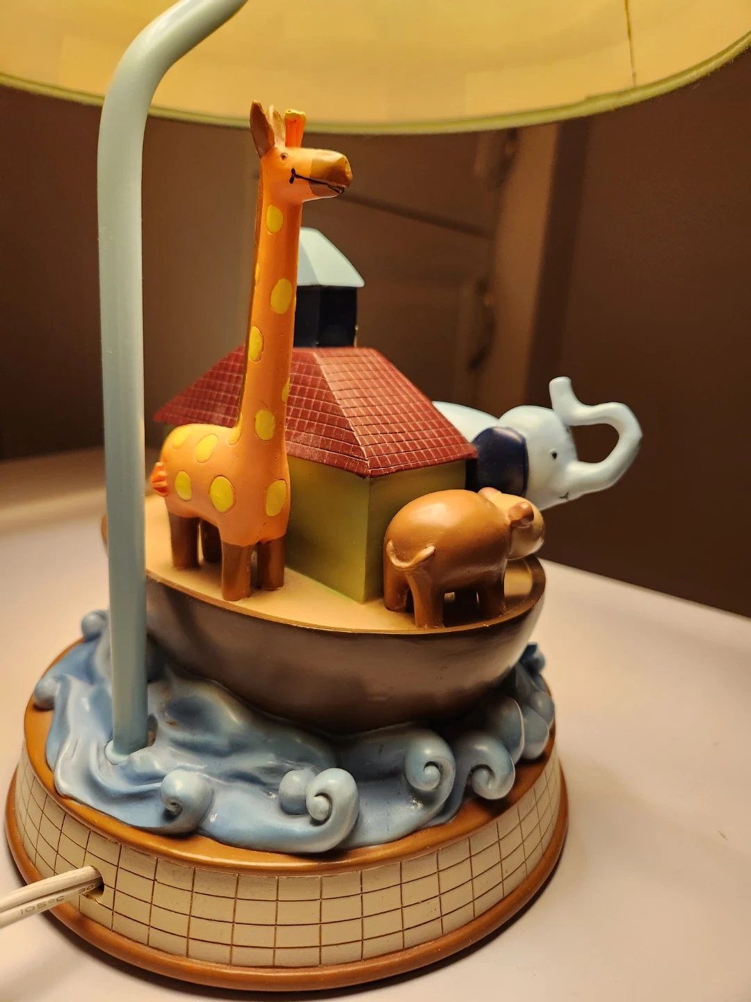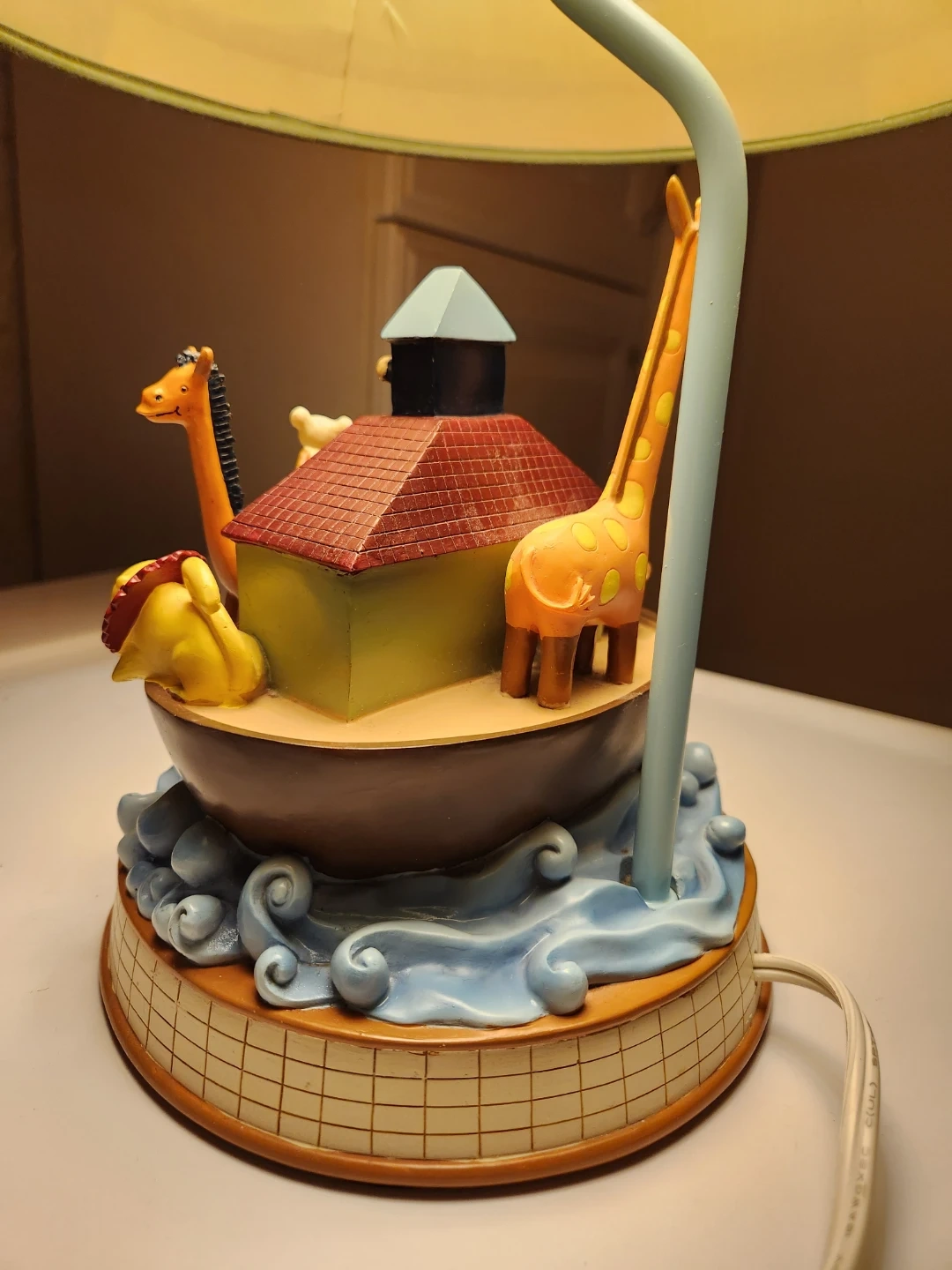 This adorable Noah's Ark lamp is perfect for a child's room! It features a variety of cute animals on the ark, including an elephant, giraffe, lion, and more. The base has a wavy water design. It's sure to bring a touch of whimsy to any space