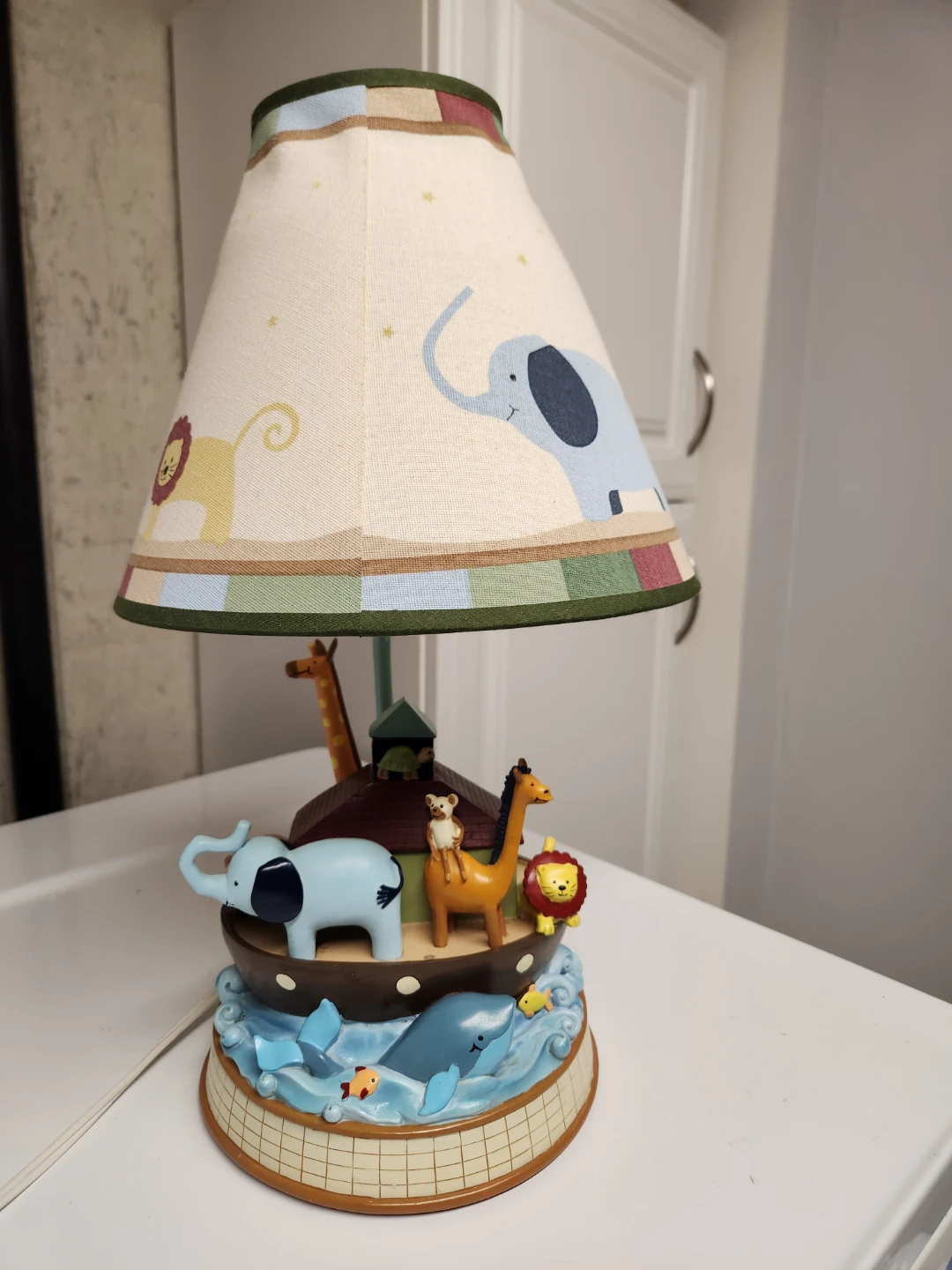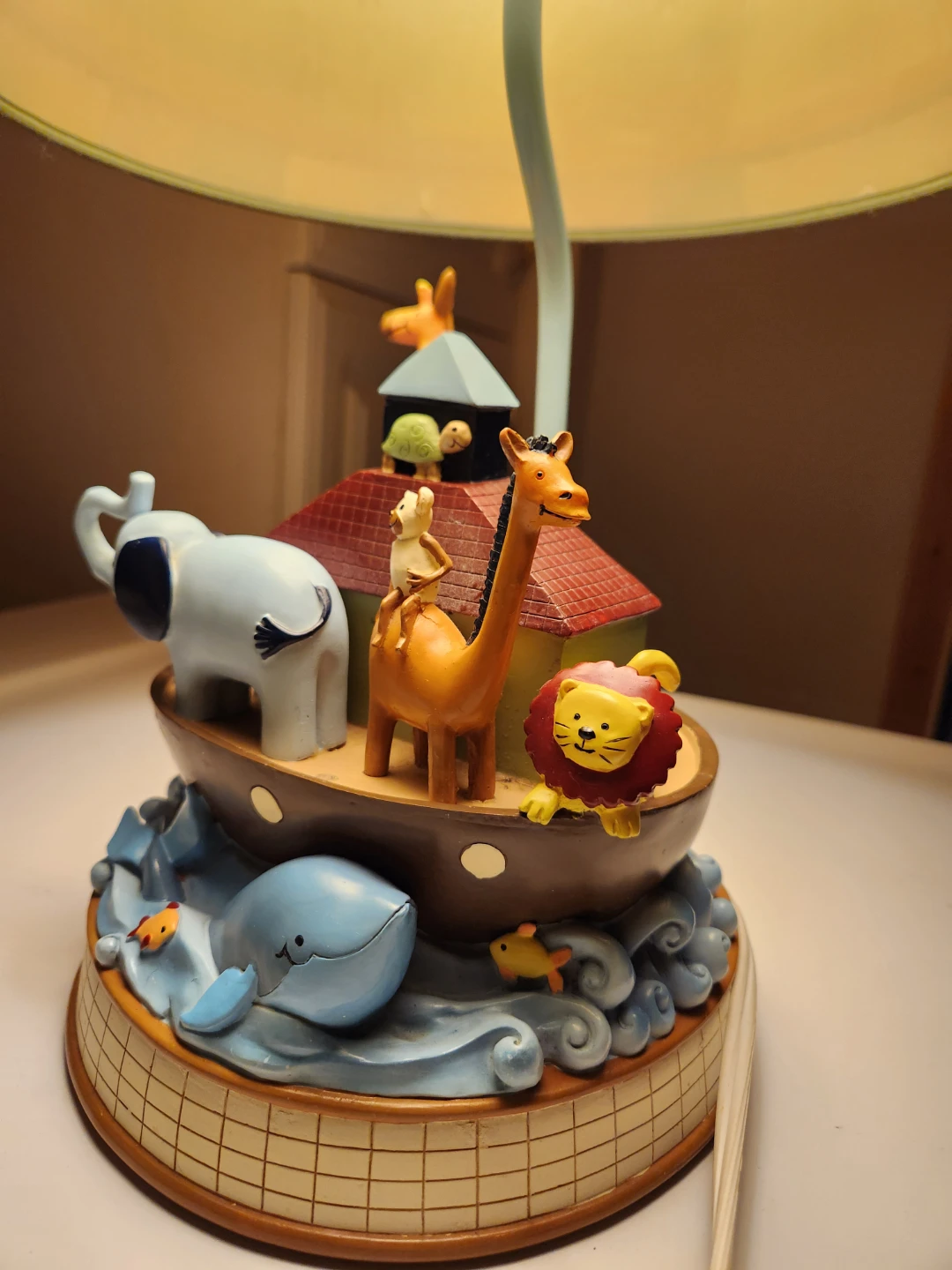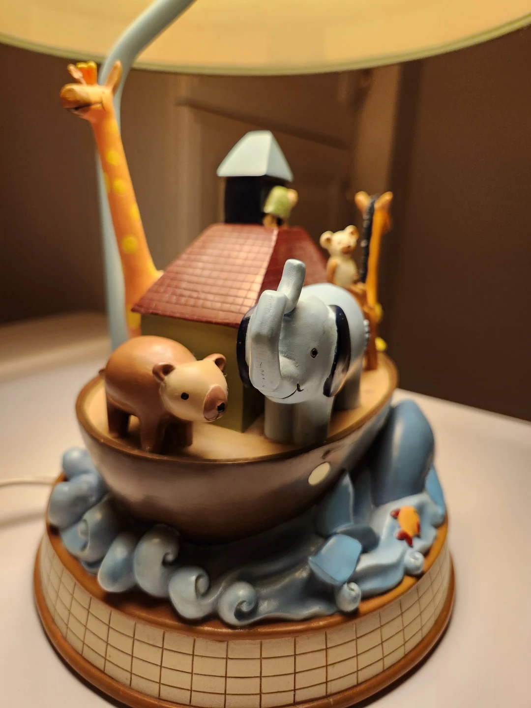 This adorable Noah's Ark lamp is perfect for a child's room! It features a variety of cute animals on the ark, including an elephant, giraffe, lion, and more. The base has a wavy water design. It's sure to bring a touch of whimsy to any space