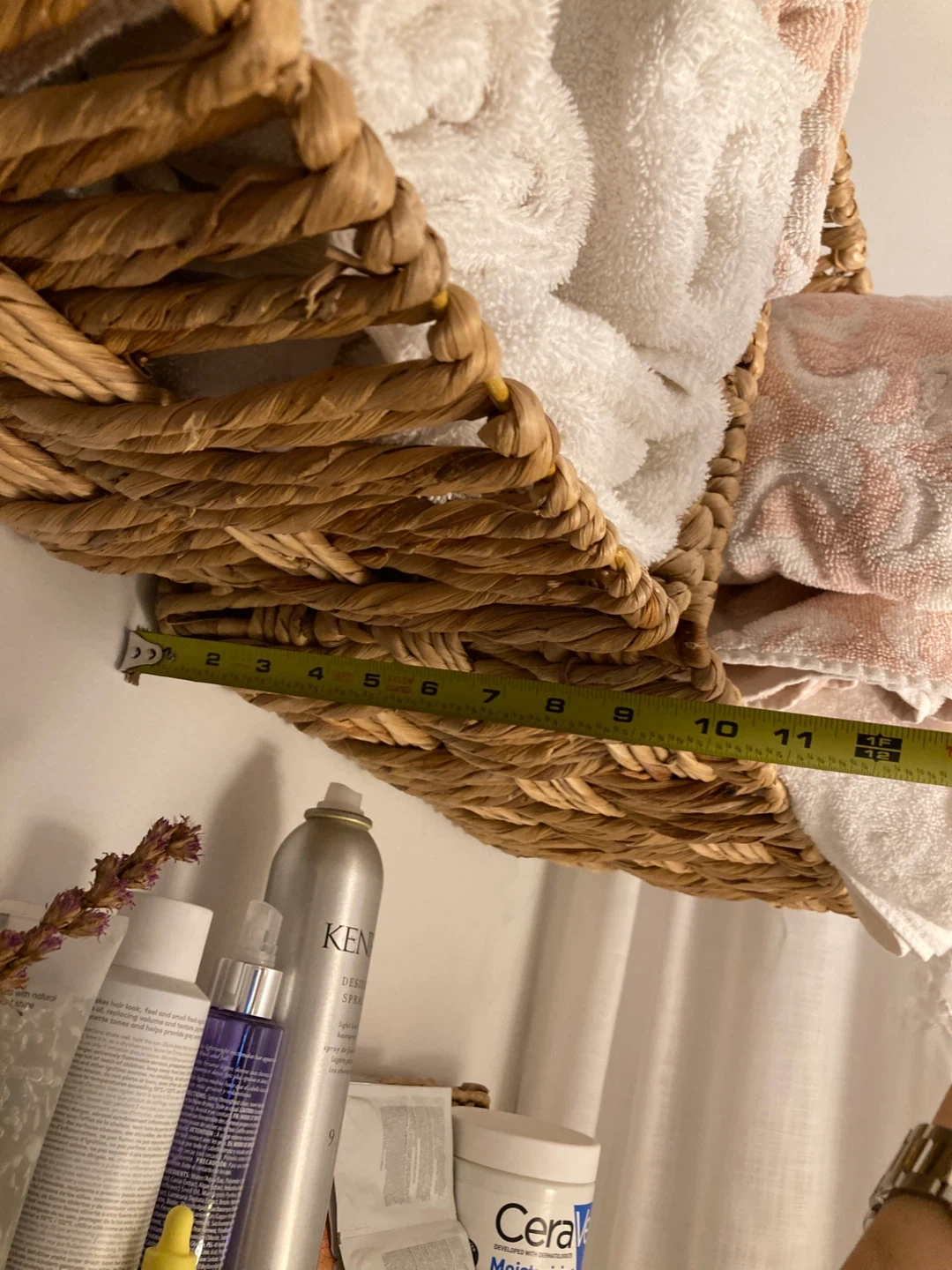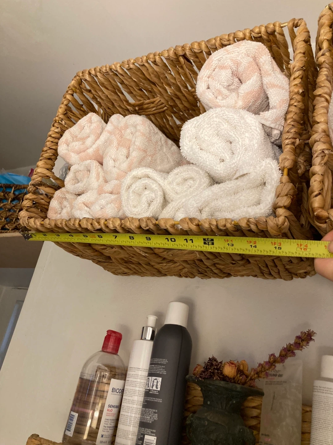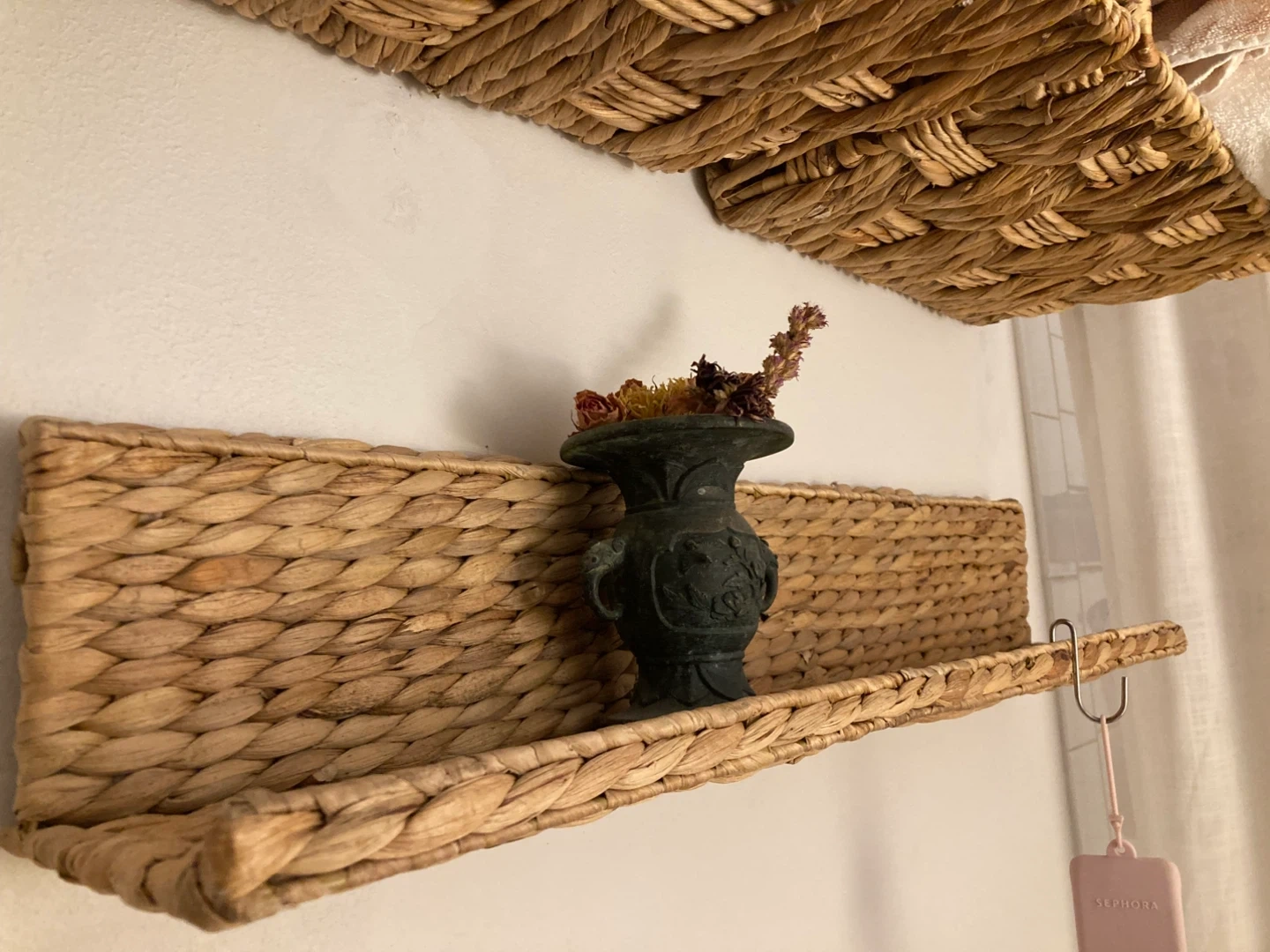 One woven shelf and two woven storage baskets. Shelf 30 inches long and 6 inches deep. Each basket is approximately 15 inches long, 11 inches high and 9 inches deep. It's perfect for organizing linens or other household items! Pickup only.