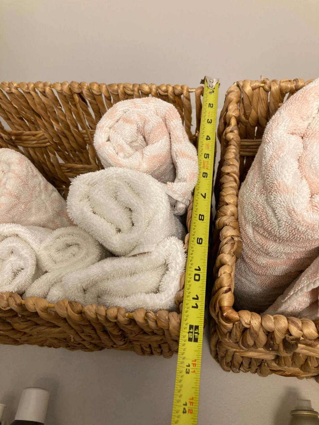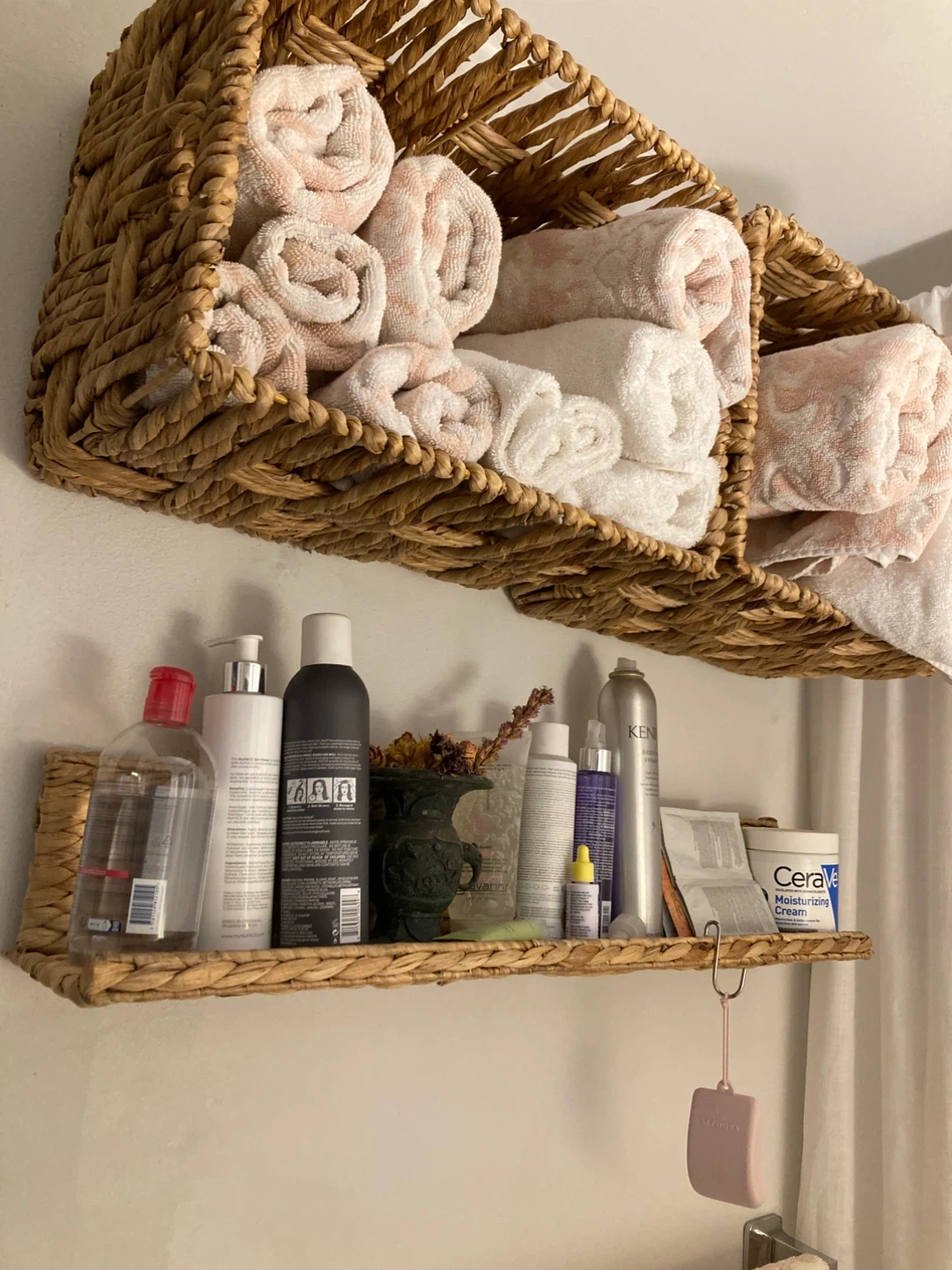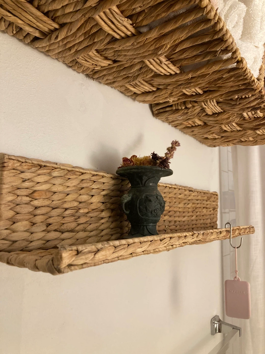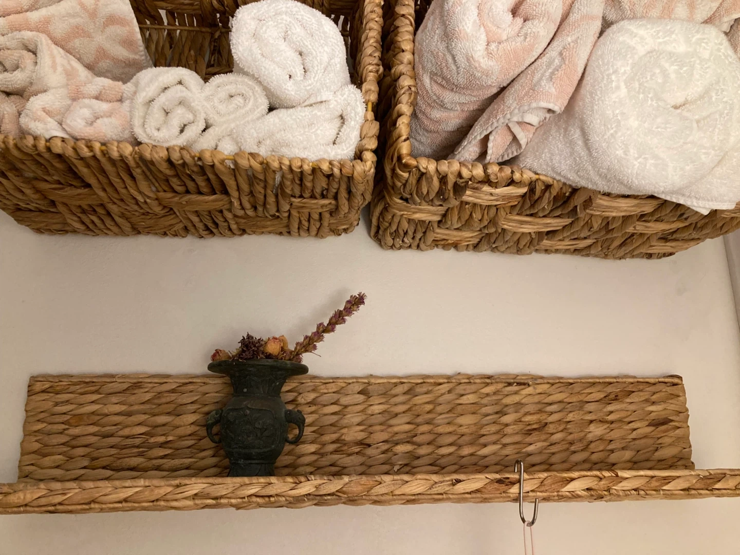 One woven shelf and two woven storage baskets. Shelf 30 inches long and 6 inches deep. Each basket is approximately 15 inches long, 11 inches high and 9 inches deep. It's perfect for organizing linens or other household items! Pickup only.
