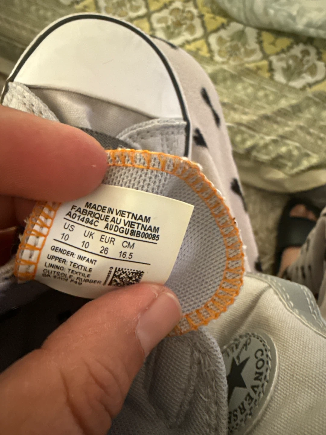 These are infant Converse high top sneakers in grey. They're a size 10 toddler with a textile upper and rubber outsole. They feature hook-and-loop straps for easy on and off.