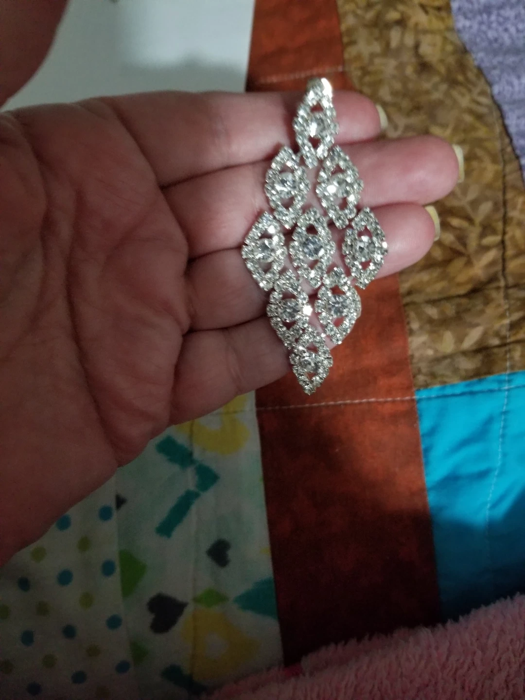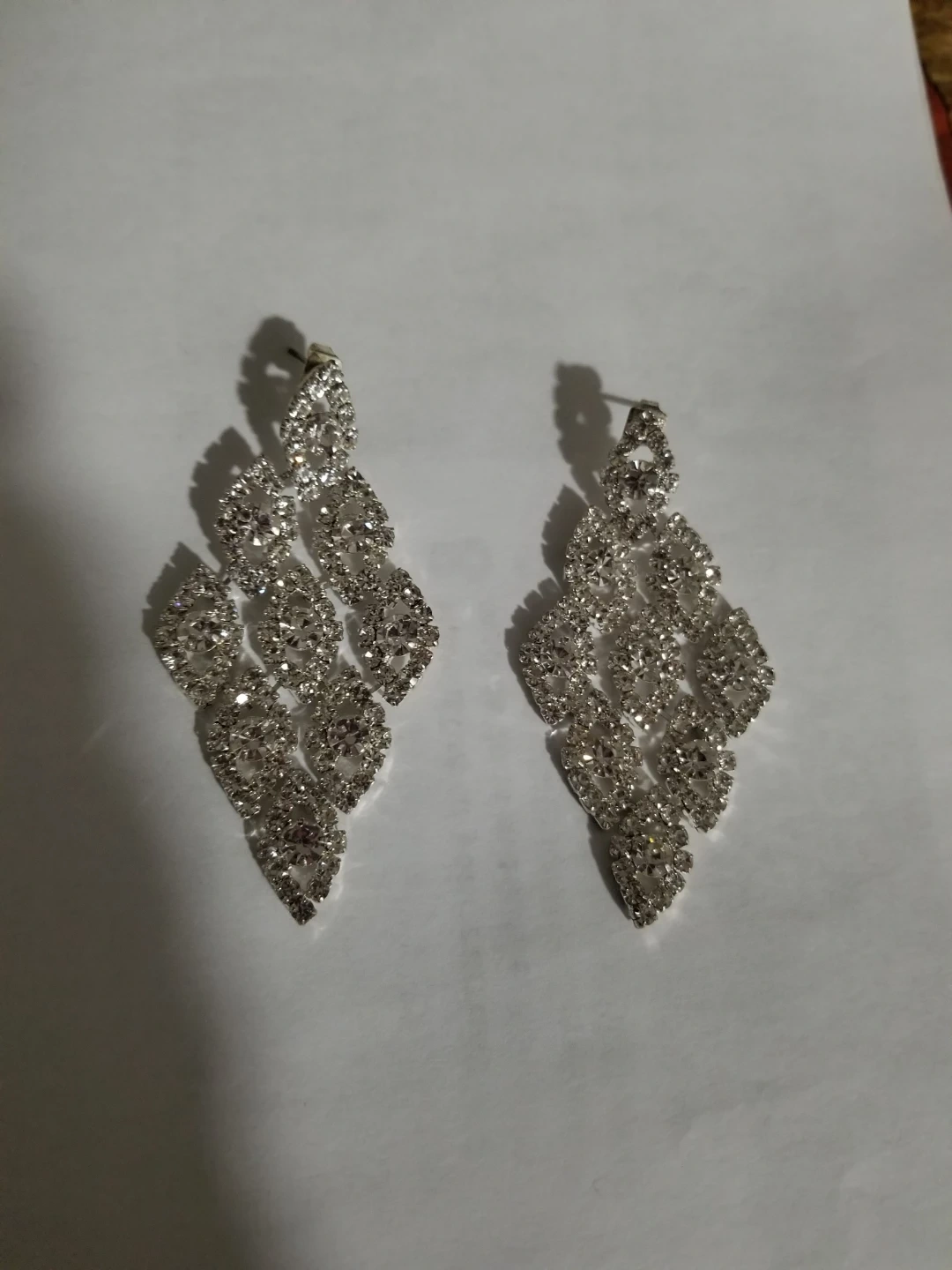 These sparkly dangle earrings feature a chandelier design encrusted with rhinestones. They're elegant and eye-catching, perfect for adding a touch of glamour to any outfit. The earrings have a drop length that makes them a statement piece. Brand new