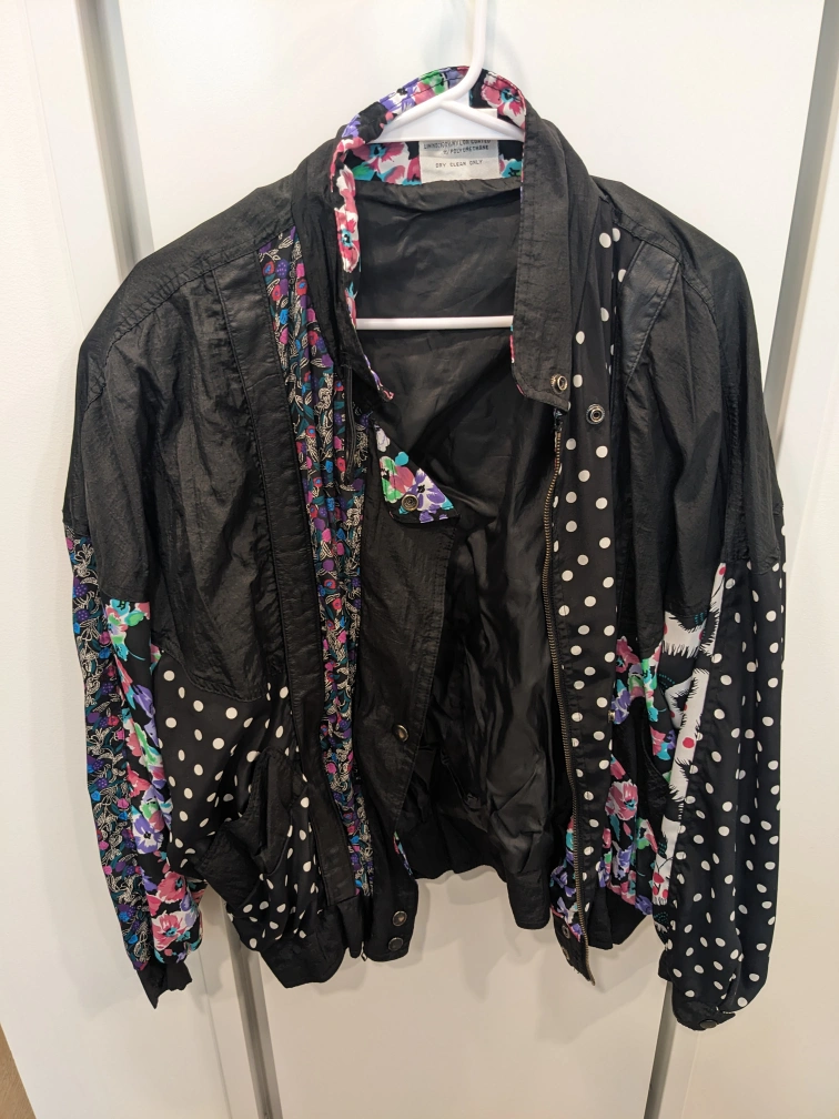 A black jacket with colourful floral and polka dot accents. The jacket is long sleeved. Zips up the front.