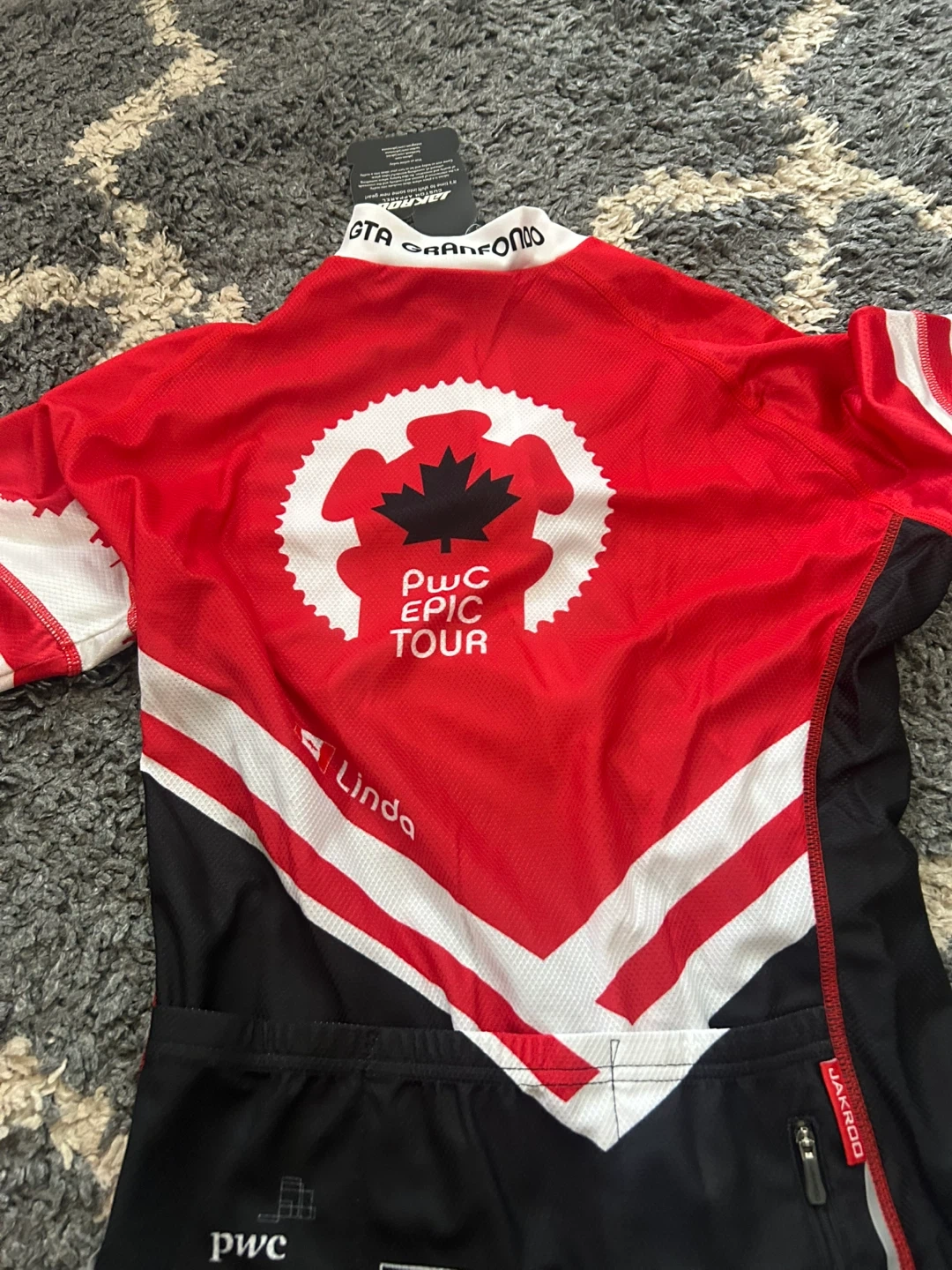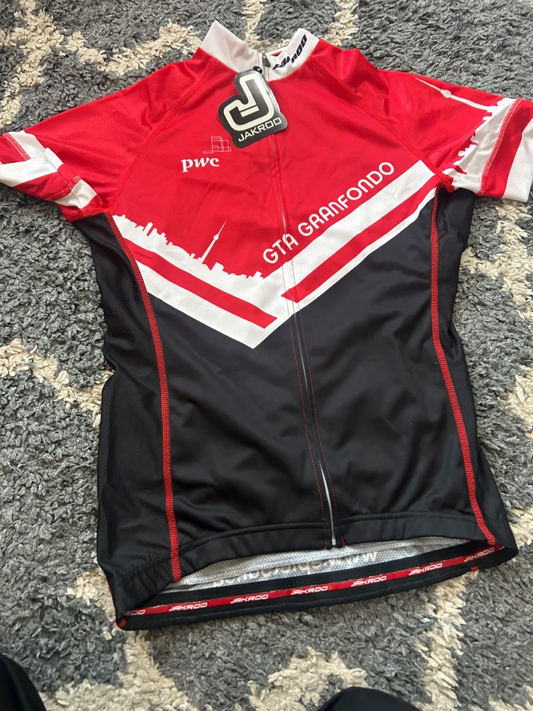 JAKROO cycling jersey for the GTA GranFondo tour. It's a size medium with a full-zip front and three back pockets. Breathable, quick-dry fabric.