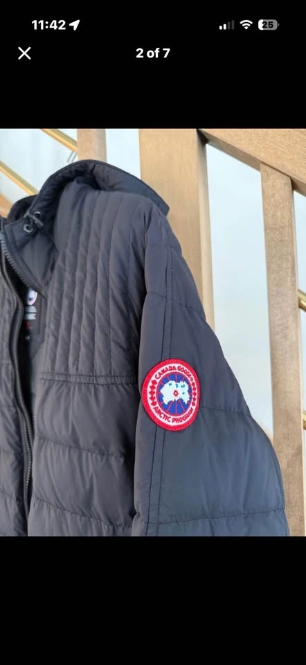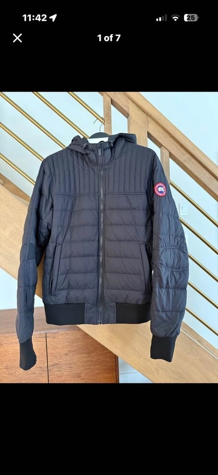 Premium Canada Goose lightweight down jacket in black. This piece has a full-zip front, attached hood, and signature Arctic Program patch on the sleeve. It features vertical quilting on the upper chest and horizontal quilting on the body. Ribbed knit cuffs and waistband provide a secure fit. Two zippered hand pockets are on the front.