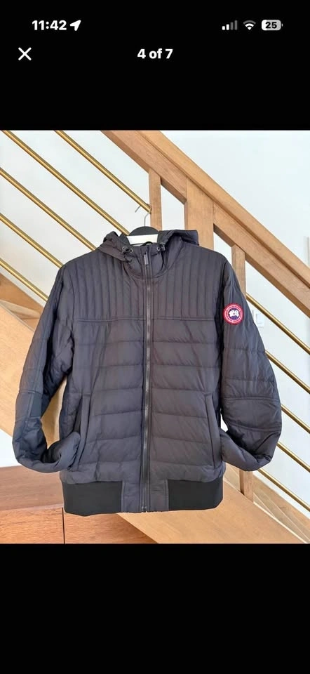 Premium Canada Goose lightweight down jacket in black. This piece has a full-zip front, attached hood, and signature Arctic Program patch on the sleeve. It features vertical quilting on the upper chest and horizontal quilting on the body. Ribbed knit cuffs and waistband provide a secure fit. Two zippered hand pockets are on the front.