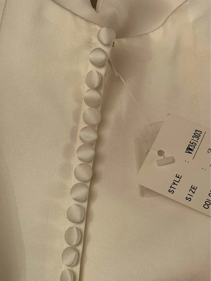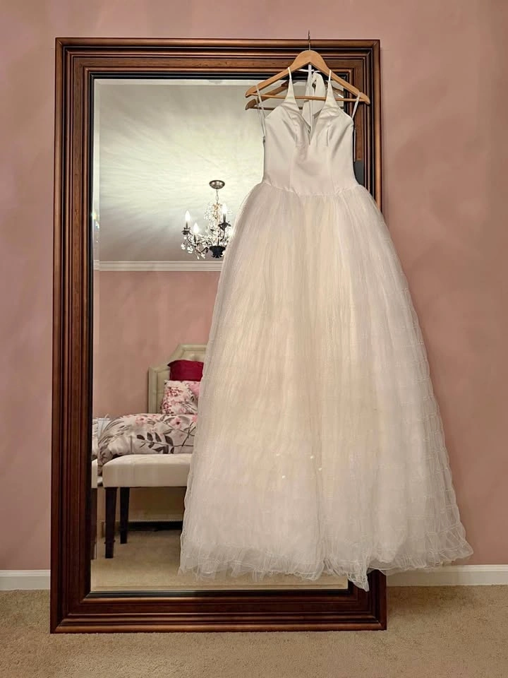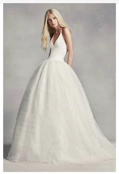 Gorgeous, brand new, Vera Wang halter neck wedding gown with button detail on back. Size 2, ivory. Features a full skirt and train of tulle. Never been worn, tags attached. Originally $1400.