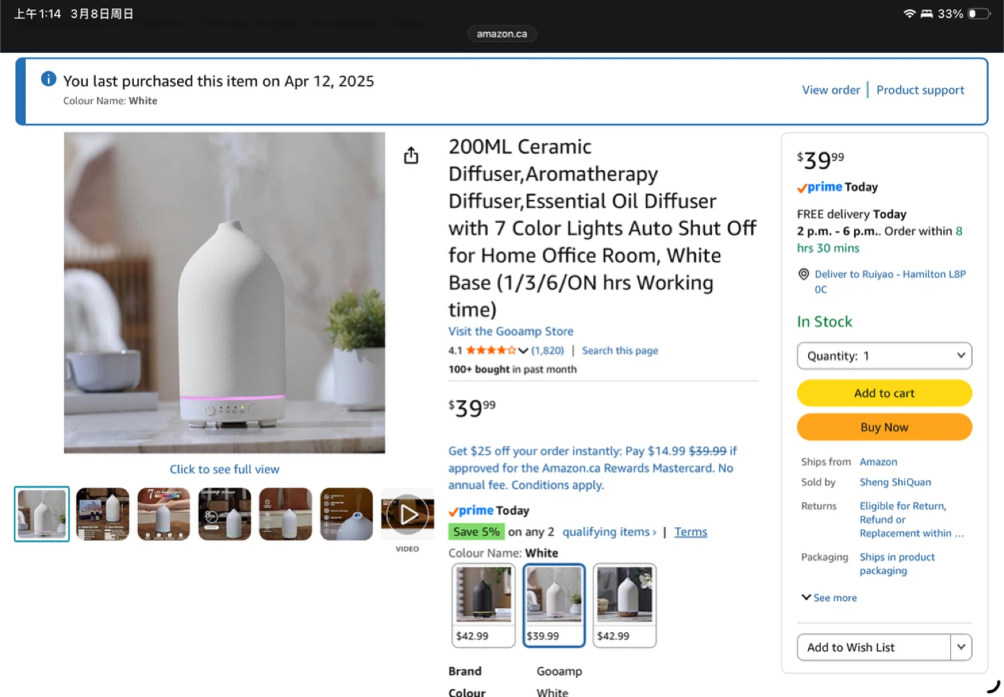 This is a 200ML ceramic aromatherapy diffuser. It has 7 colour lights and auto shut-off. The working time can be set to 1H, 3H, or 6H.