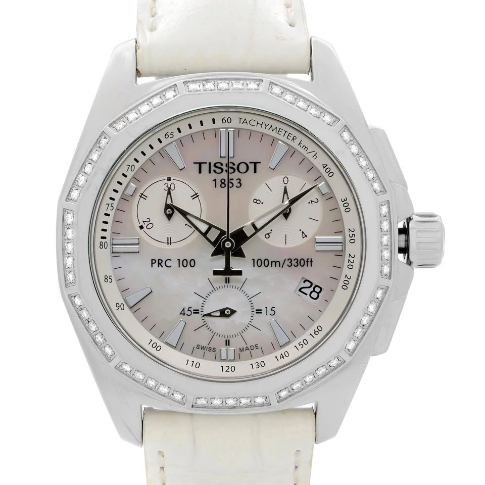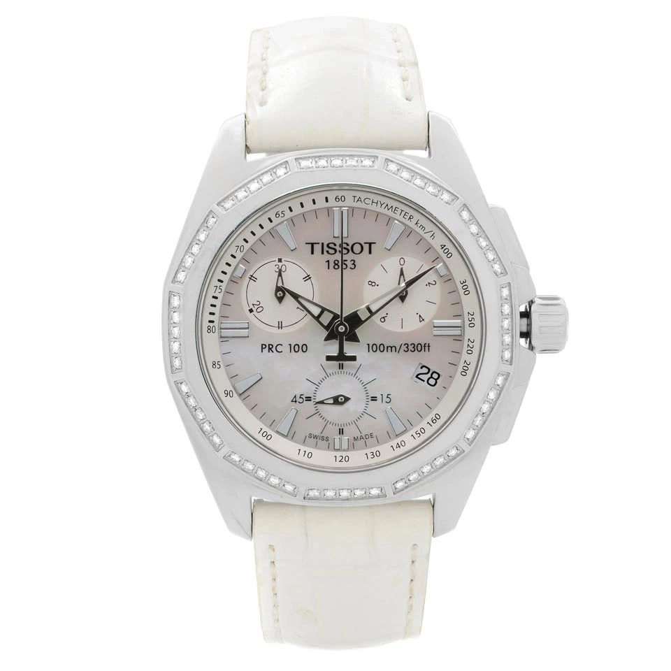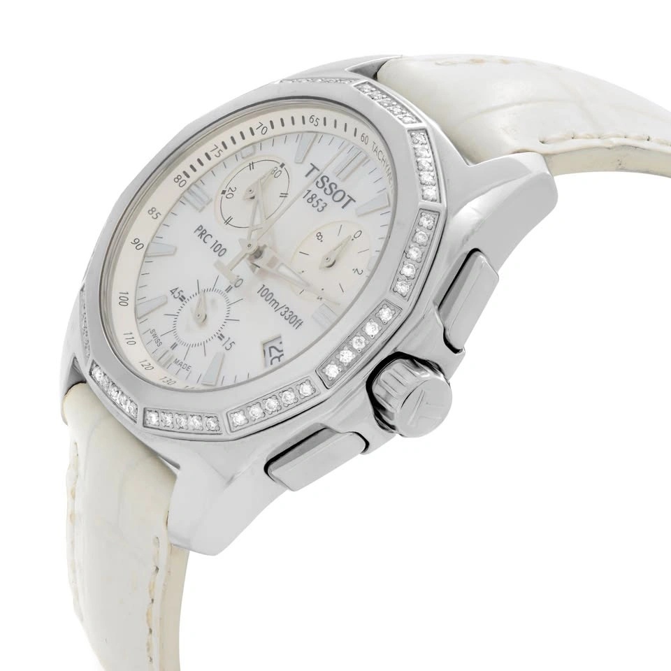 Up for sale is a pre-owned Tissot PRC 100 T22.1.456.21. This watch features a stainless steel case, a white leather strap, and a fixed stainless steel bezel with diamonds. The mother-of-pearl dial has luminous silver-tone hands and index hour markers. It includes a tachymeter on the outer rim and a date display at the 4 o'clock position. The chronograph has three sub-dials for seconds, minutes, and hours. The original box and papers are not included. This watch fits wrists up to 7 inches.