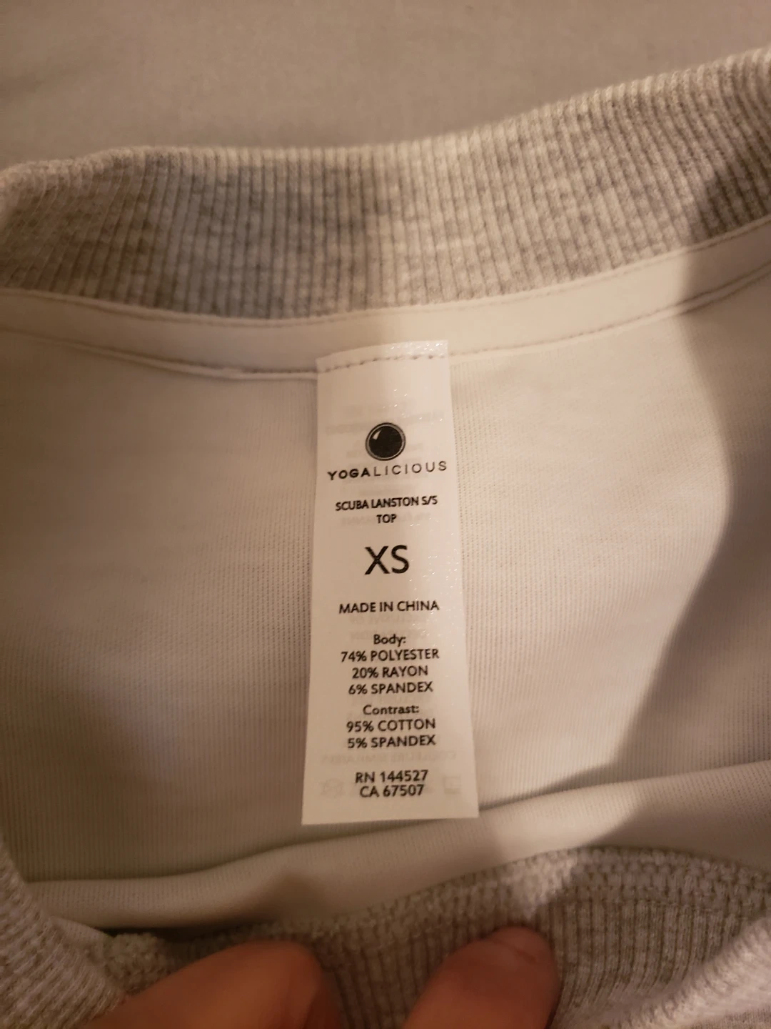 This YOGALICIOUS skort set includes a top and a skort. It's made of 74% polyester, 20% rayon, and 6% spandex with a contrast of 95% cotton and 5% spandex. The size is XS.