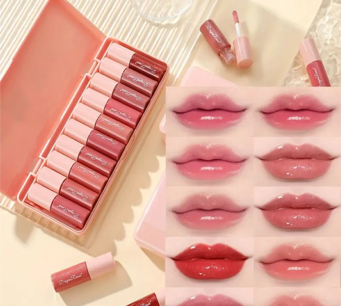 This is a set of 10 lip glosses in a pink case. The case has cute bear and bunny designs. It's a nice gift for makeup lovers.