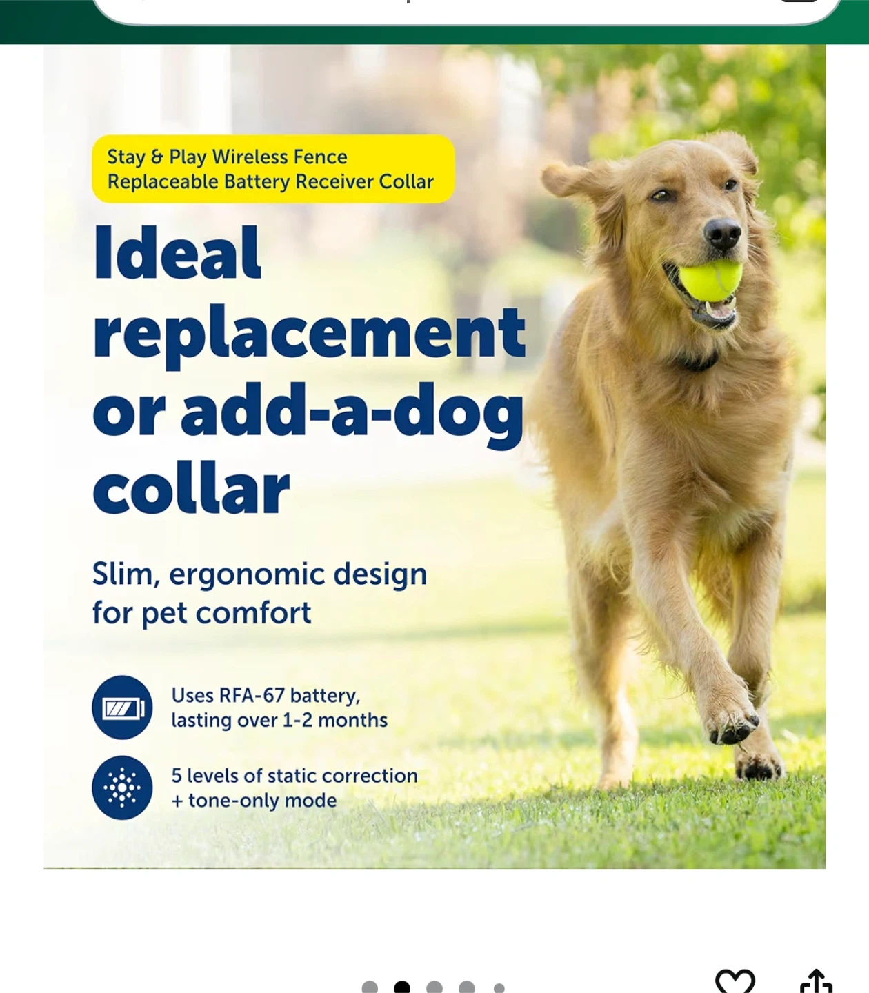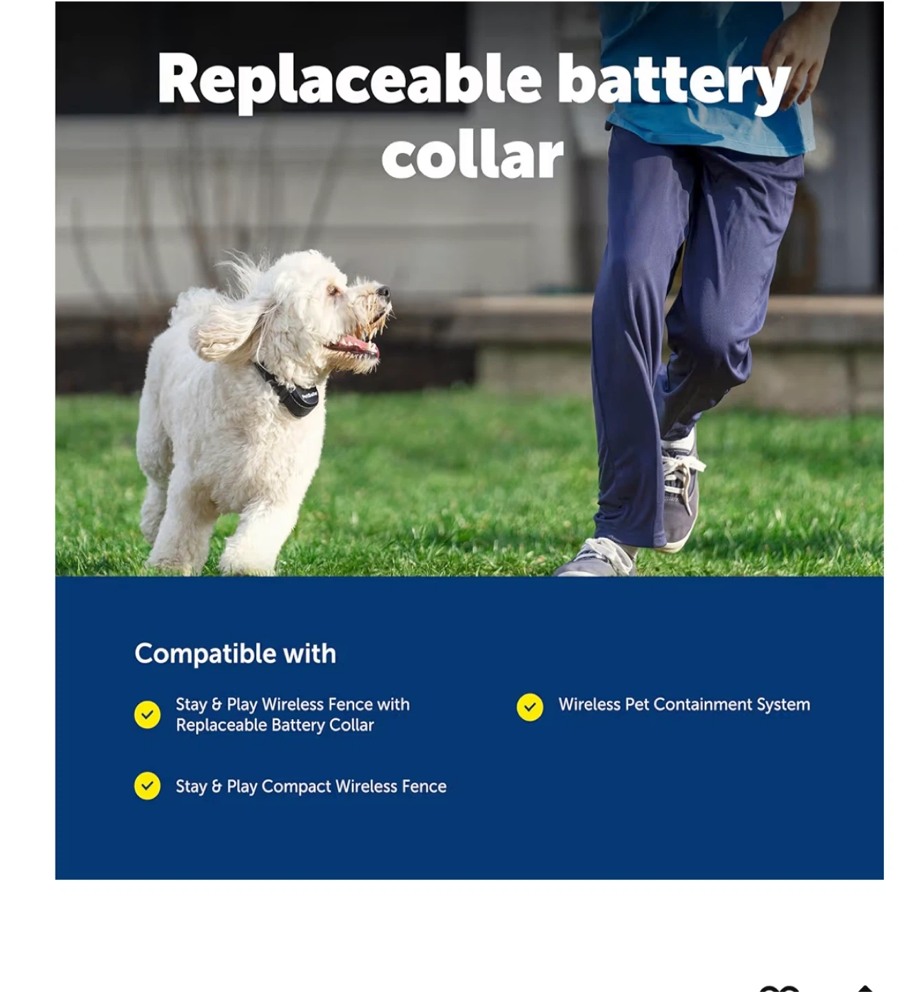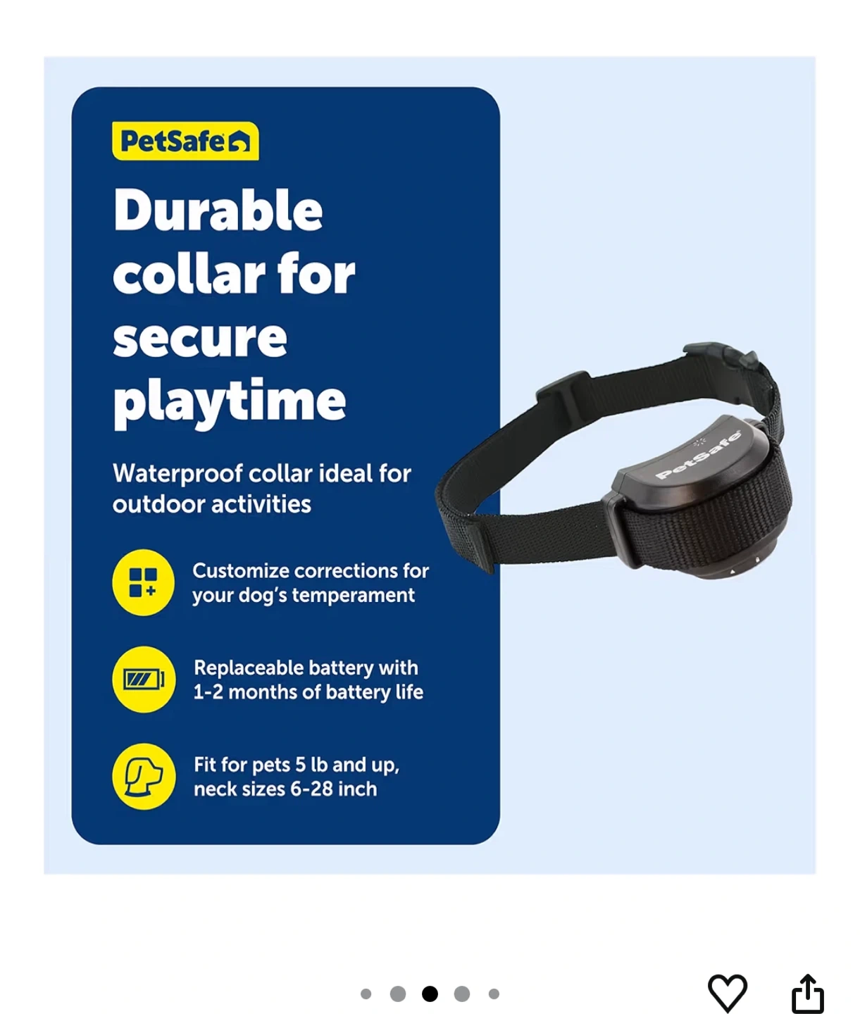This is a PetSafe waterproof, adjustable, and ergonomic collar for your dog. It's a durable collar for secure playtime and is ideal for outdoor activities. It fits pets 5 lb and up, neck sizes 6-28 inch. Customize corrections for your dog’s temperament. It also has a replaceable battery with 1-2 months of battery life