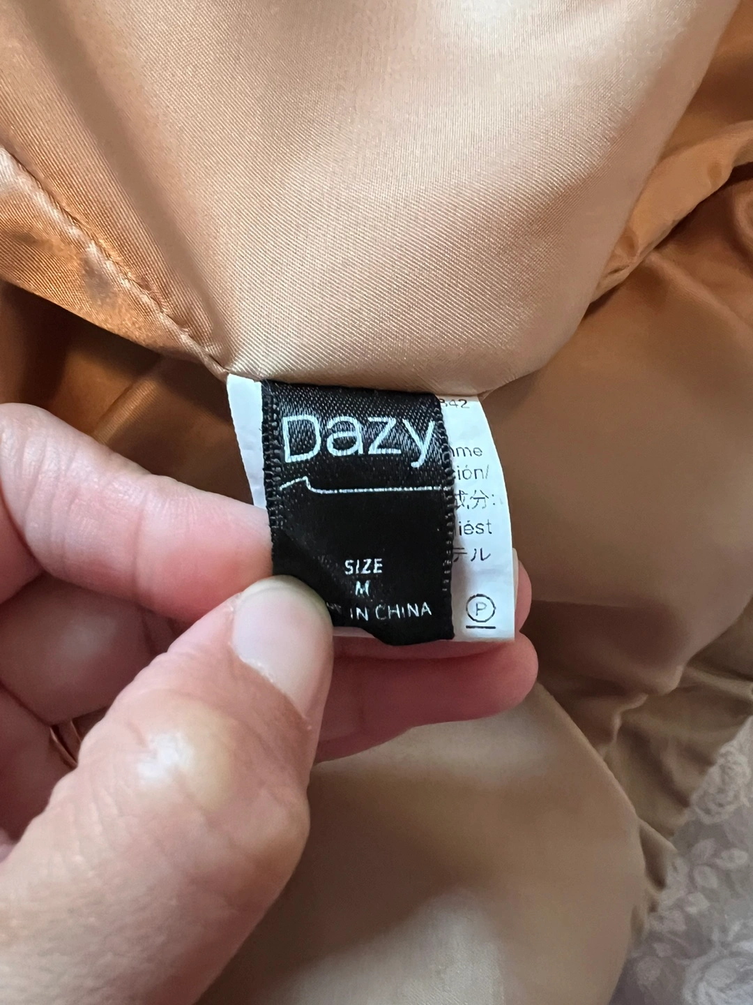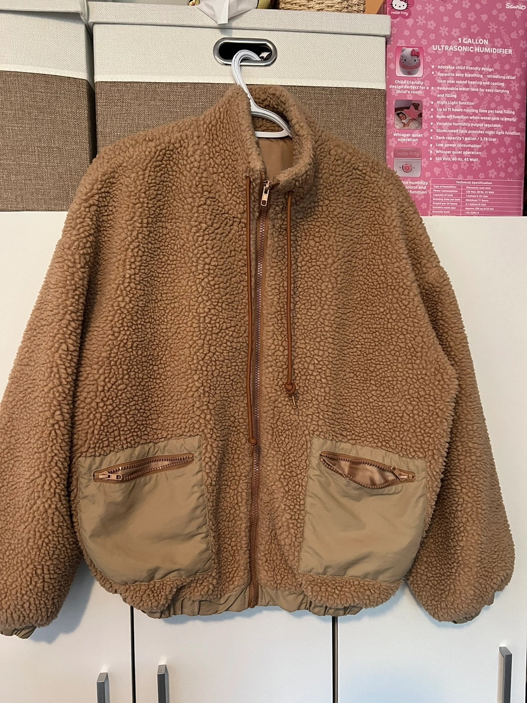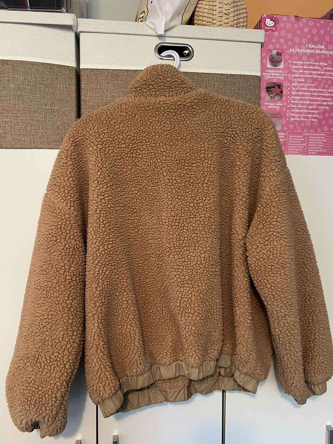 Brown teddy fleece jacket with zipper closure and pockets. Elastic waistband. Size M. In good condition.