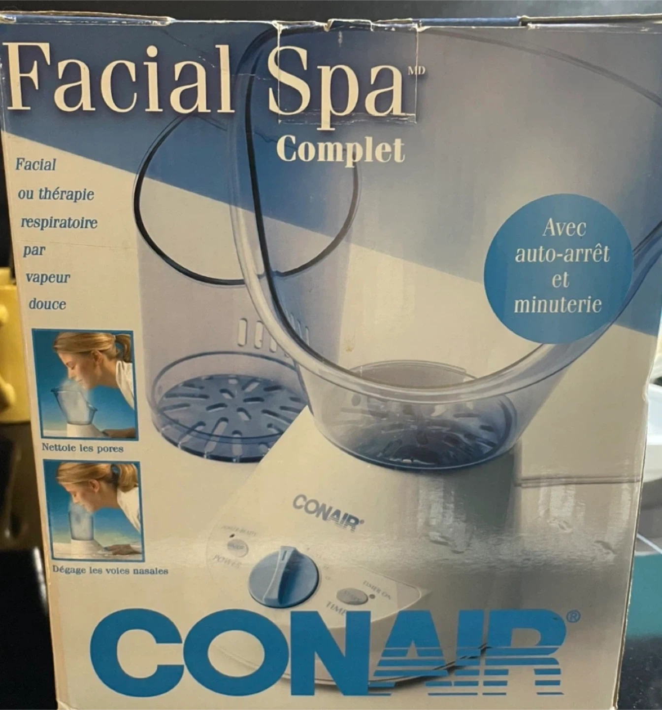 This Conair Facial Spa Complet is designed for gentle steam therapy. It includes a main unit and two cups. It's suitable for facial cleansing and nasal congestion relief.