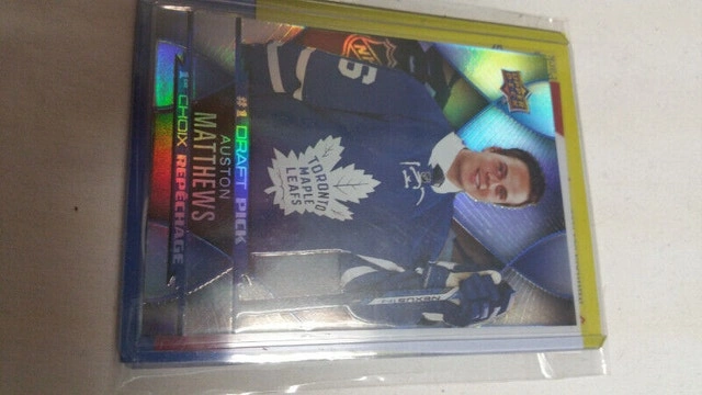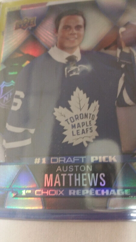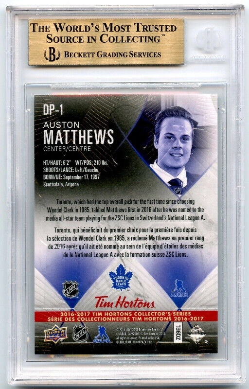 2016-17 Auston Matthews Upper Deck Tim Hortons #1 Draft Pick DP-1 Redemption Rookie Mint. I NEVER TOOK IT OUT OF THE PLASTIC IN CAME IN THE CARD SHOULD BE A 10 GRADE THE LAST PHOTO OF THE BACK OF THE CARD WAS COPIED FROM THE WEB .MINE CARD AS THE COM.C CARD COVERING THE BACK OF THE CARD The card pictured is the exact card you will receive. This is one of Matthews rarest rookies CARD. Let me know if you're interested!