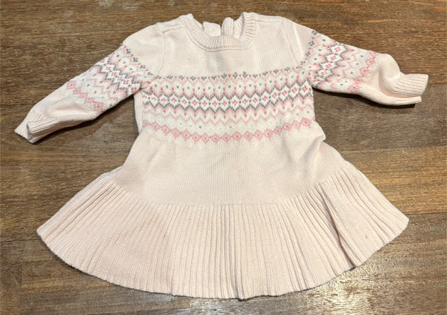 This sweet baby girl's dress features a pink knit design with a fair isle pattern on the bodice and sleeves. It has a pleated skirt for extra flair. Made from soft knit material, it's perfect for keeping little ones cozy.