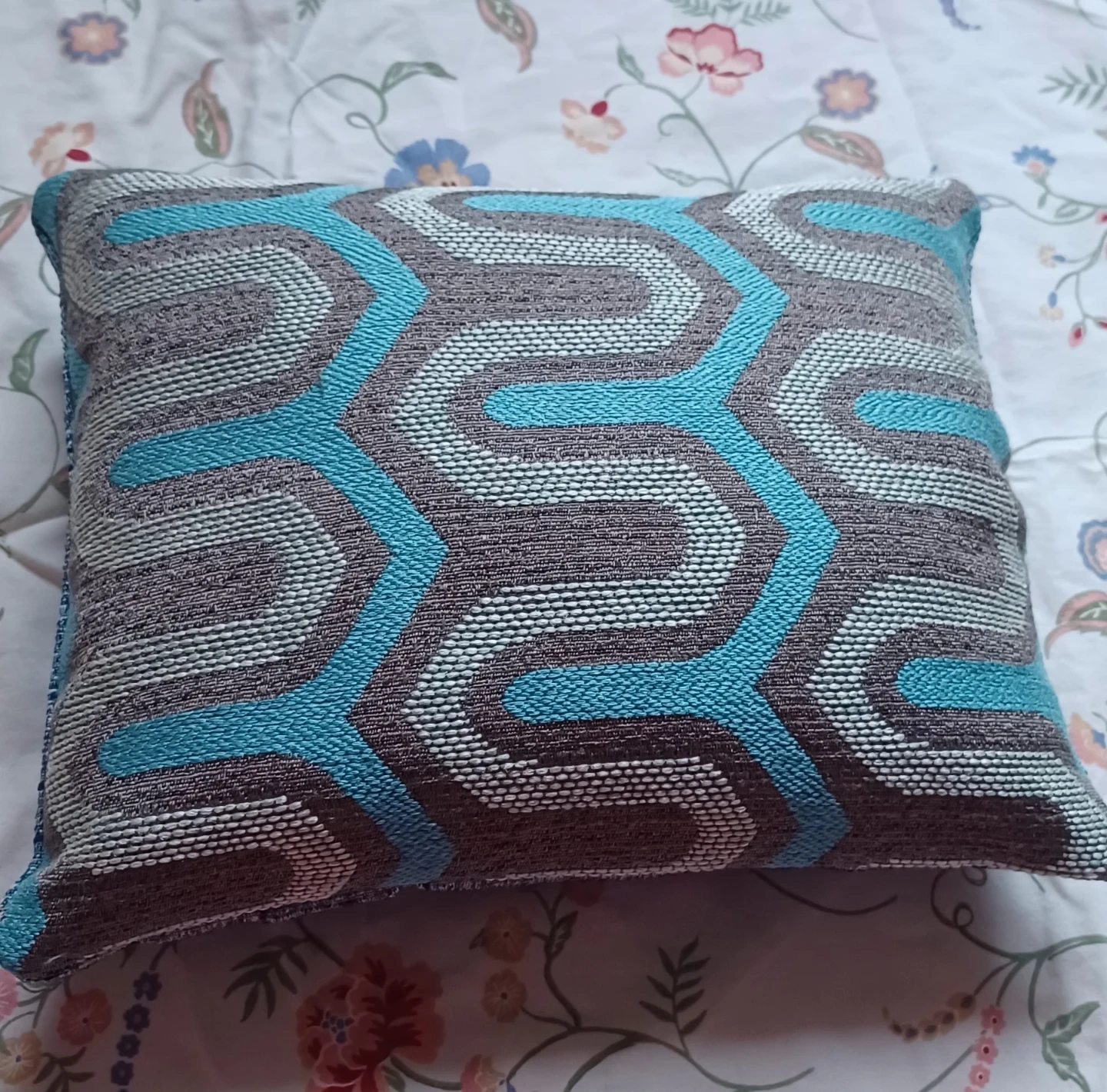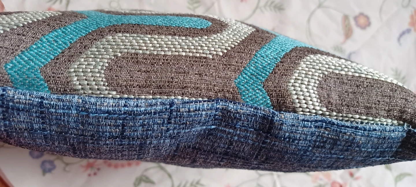 Decorative throw pillow featuring a brown, grey, and teal geometric pattern. Measures approximately 11 inches by 17 inches. Fabric material.