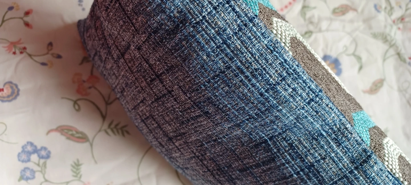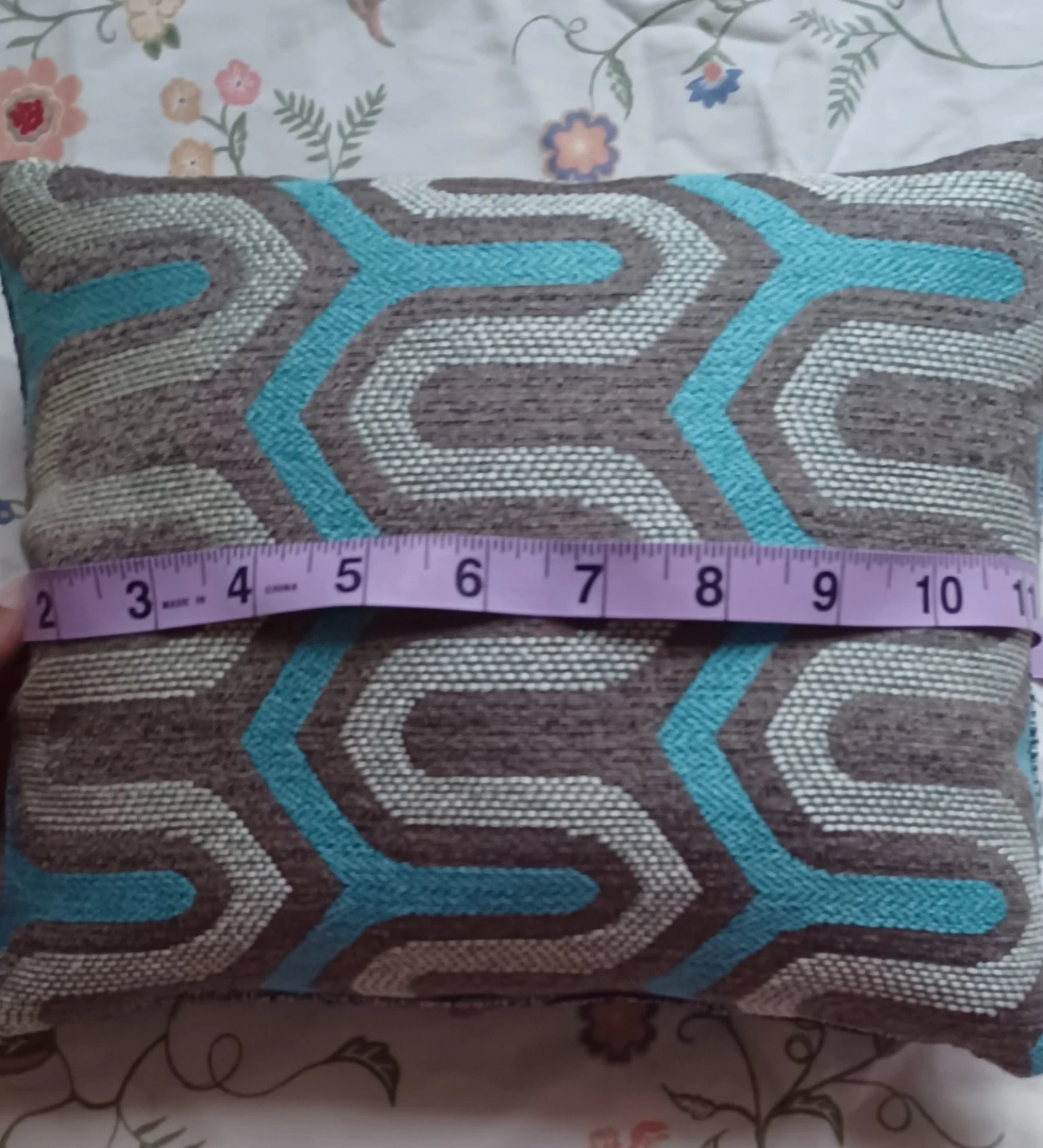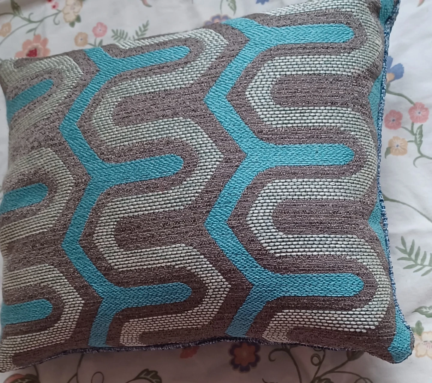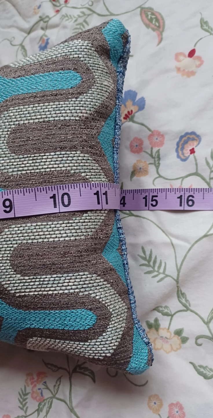 Decorative throw pillow featuring a brown, grey, and teal geometric pattern. Measures approximately 11 inches by 17 inches. Fabric material.