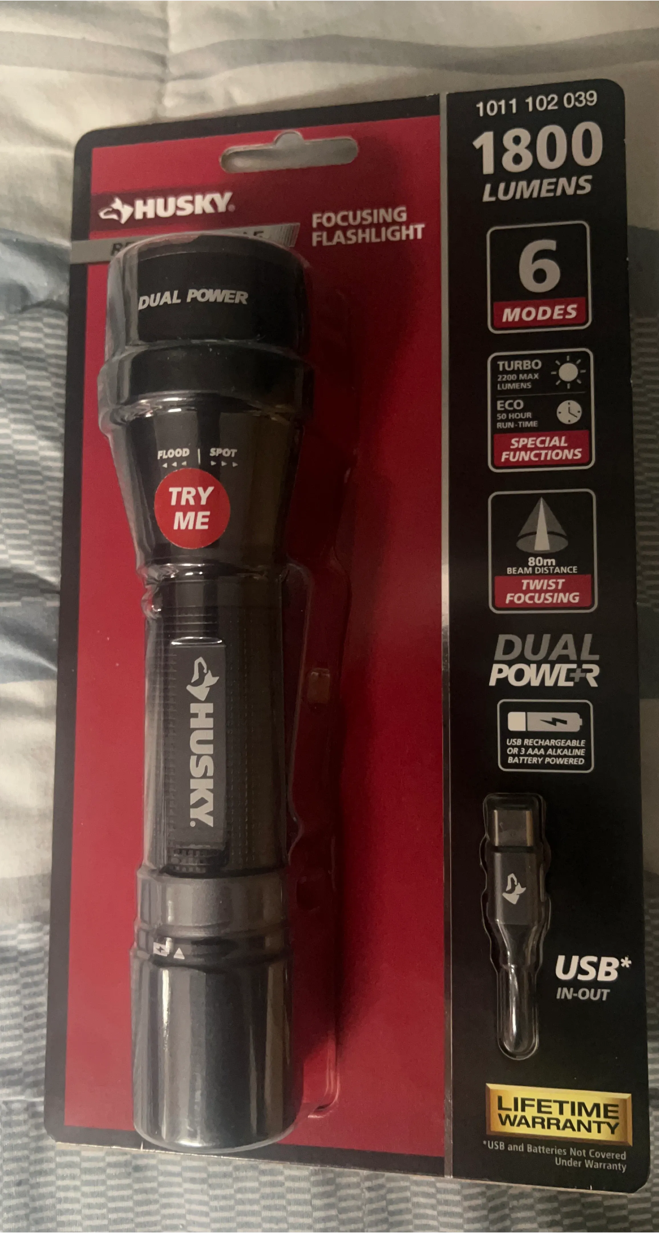 This is a Husky brand focusing flashlight with 1800 lumens. It has 6 modes and a 80m beam distance with twist focusing. It's USB rechargeable or can be powered by 3 AAA alkaline batteries.