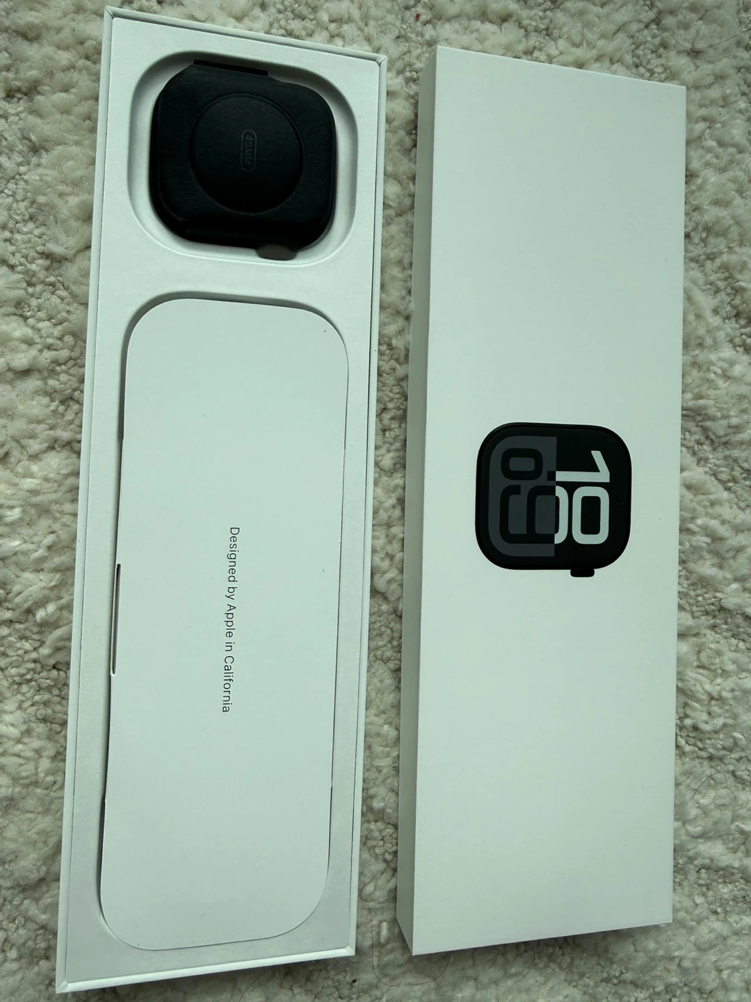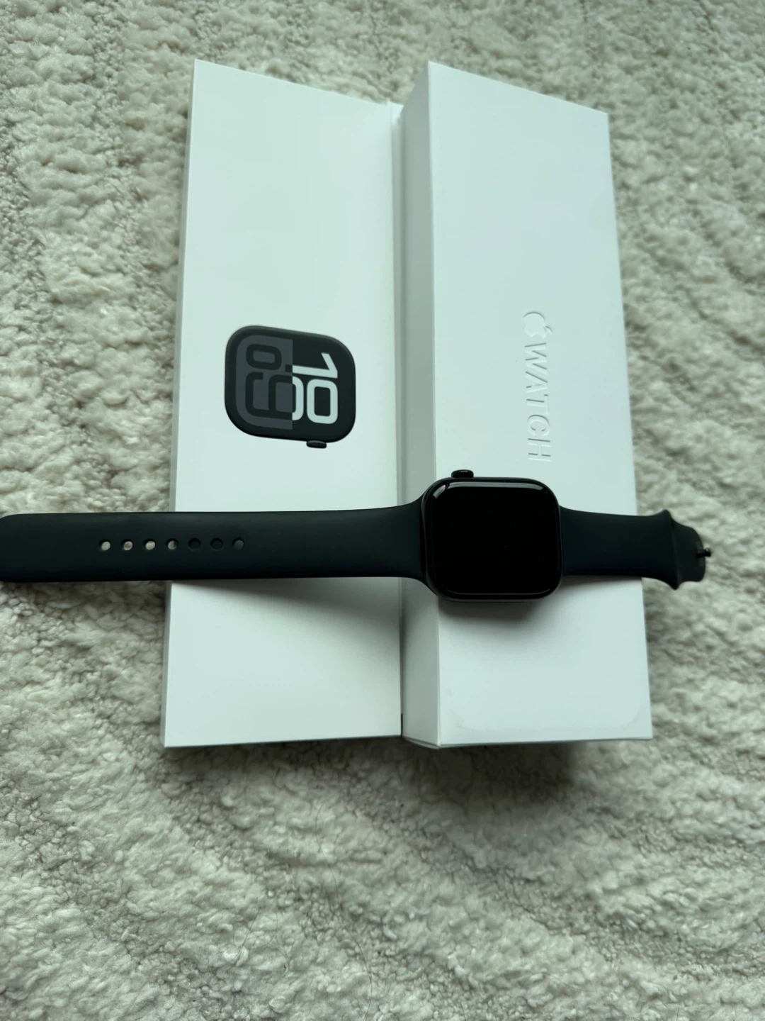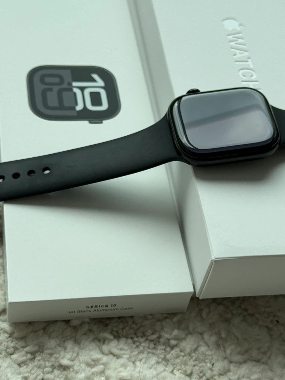 Apple Watch Series 10 with a Jet Black aluminium case and GPS. It comes with a black sport band and original packaging. Includes charger that never been open.