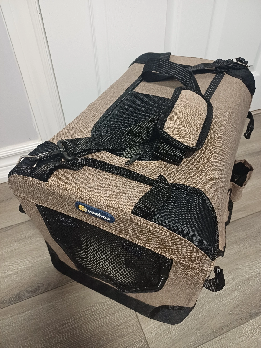 96Looking to sell a brand new...never used and a heavy duty...Veehoo pet carrier/foldable crate in great condition! It's brown and perfect for cats or small to medium dogs. The carrier measures approximately 20 inches long 13 inches in width and 13 inches in height. Easy to set-up and fold making it perfect for travel or home use. Available in 3 colors: Brown, Black and Blue.