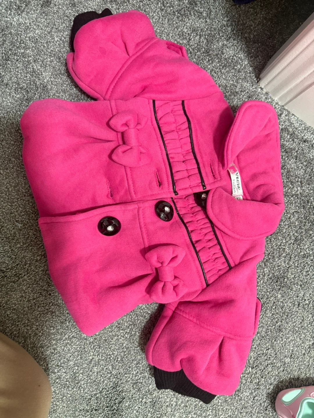 A cute pink coat from VeeSue Fashion in size 12! It features adorable bow details and black accents. Perfect for keeping your little one warm and stylish Got at my baby shower and forgot about it . Has not been worn . Brand new