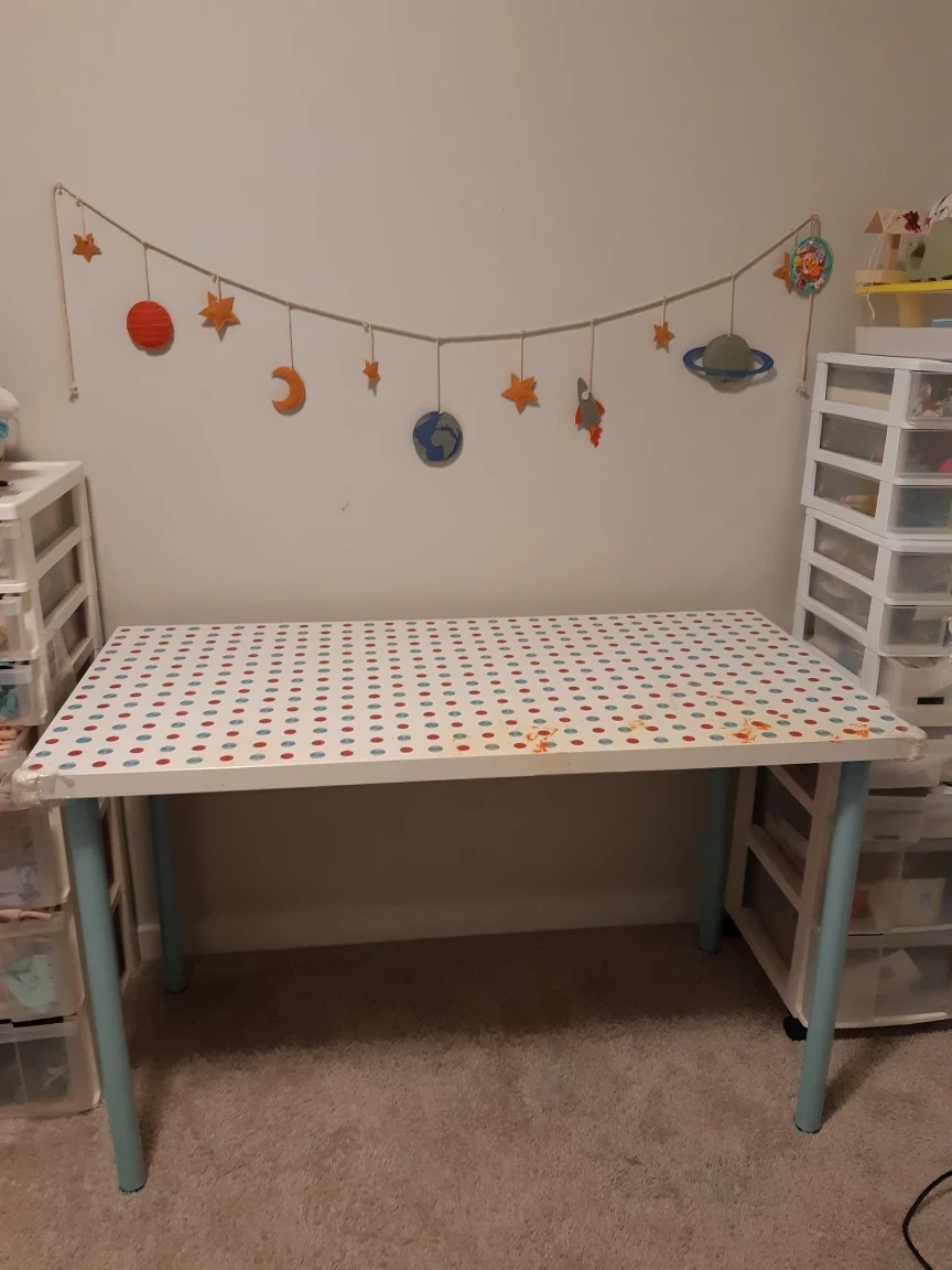 IKEA Linnmon table with red and blue button print. Legs come off easily. Disassembled and ready to transport.