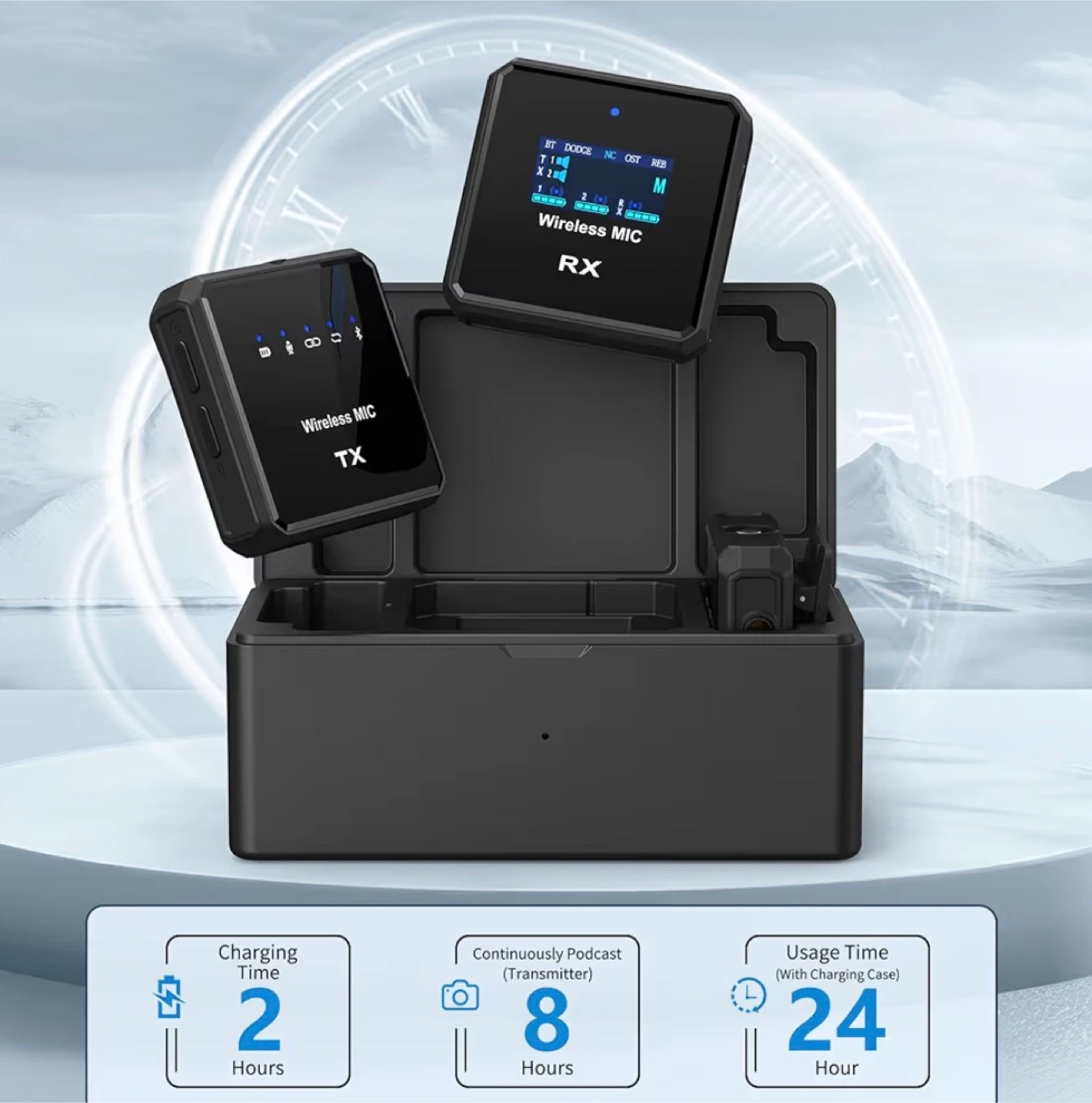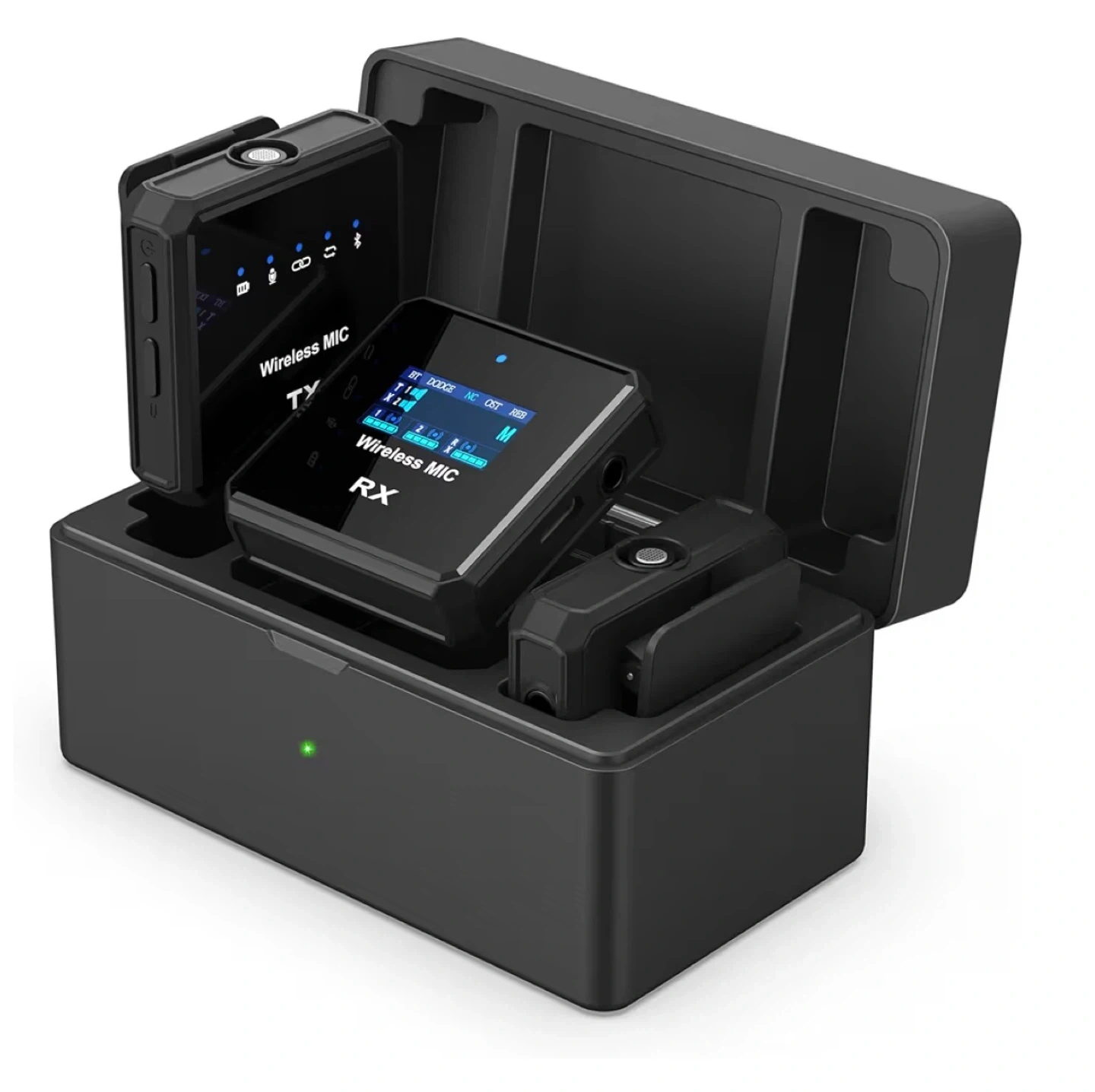 All-in-one storage, ready to use: An all-in-one design makes it ultra-portable and accessible. Two transmitters and the receiver are pre-connected, charged, and securely stored in the charging case. You won’t have to go through any complicated setup procedures, allowing you to start recording immediately.