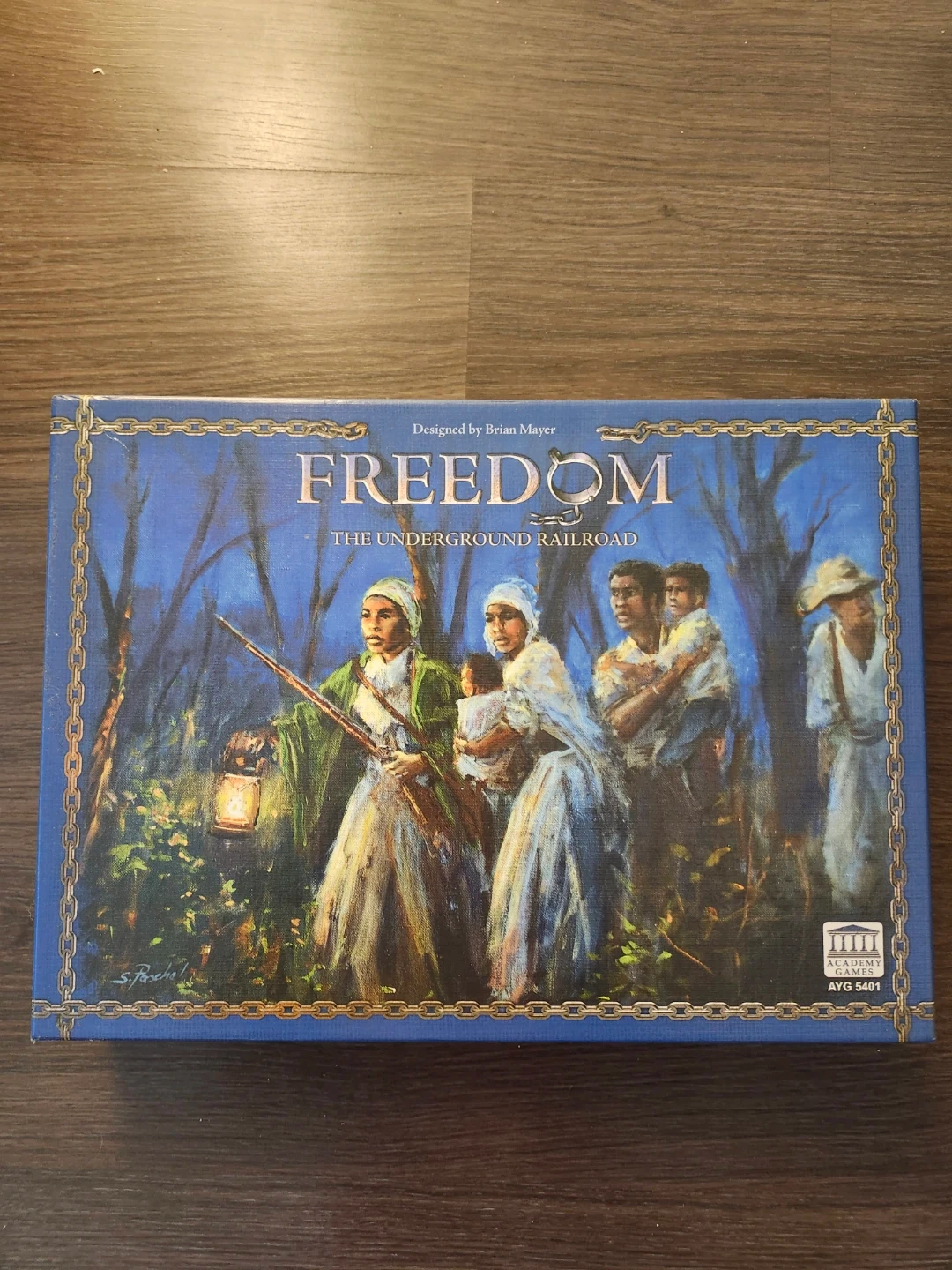 This board game is designed by Brian Mayer. It's a game about the Underground Railroad. The game comes with the Academy Games logo and code AYG 5401. It's only been played once, so it's in very good condition.