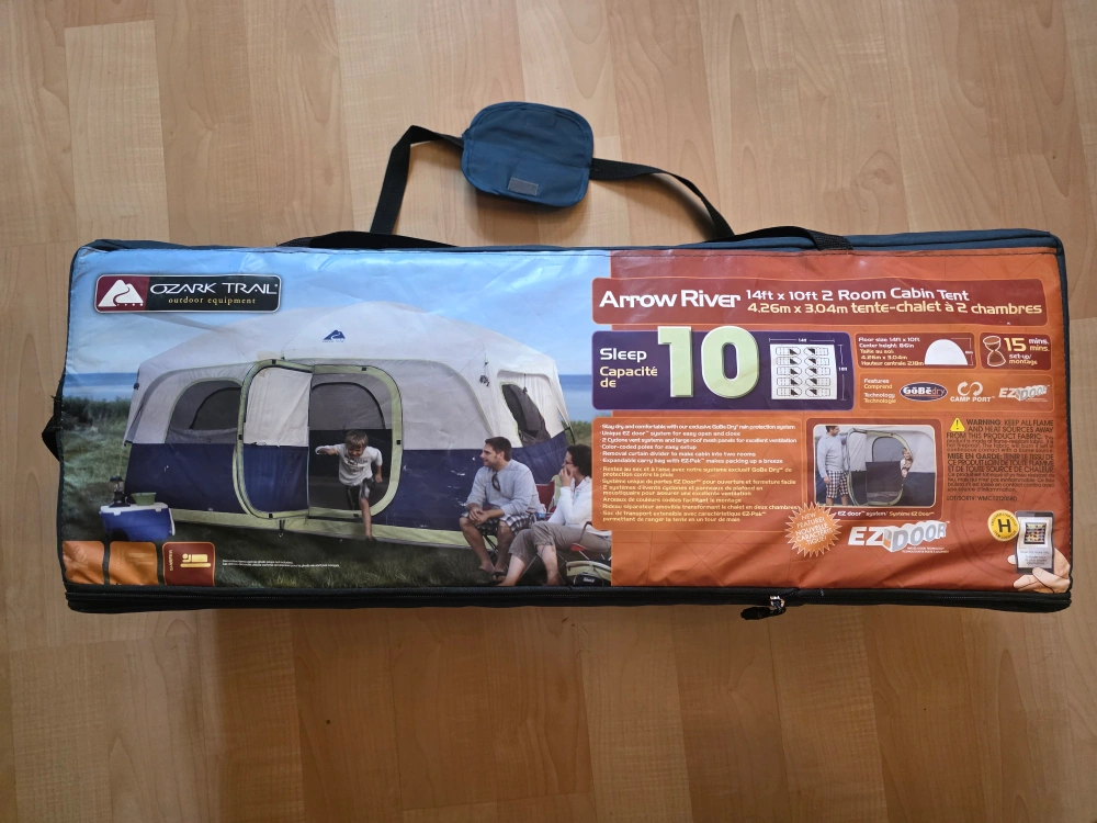 Selling an Ozark Trail Arrow River 14ft x 10ft 2 Room Cabin Tent. Sleeps up to 10 people. Comes in its original carrying bag for easy transport and storage