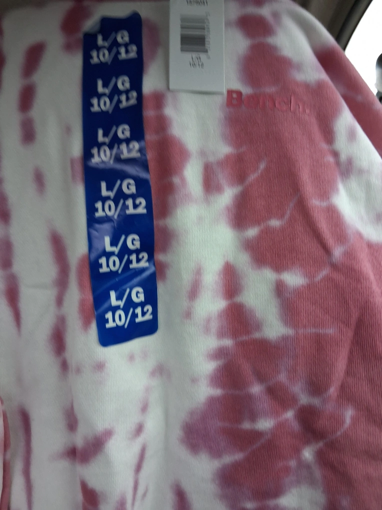 This Bench sweatshirt features a pink and white tie-dye pattern. It's a size L/G, which corresponds to sizes 10-12. The fabric feels soft and comfortable.
