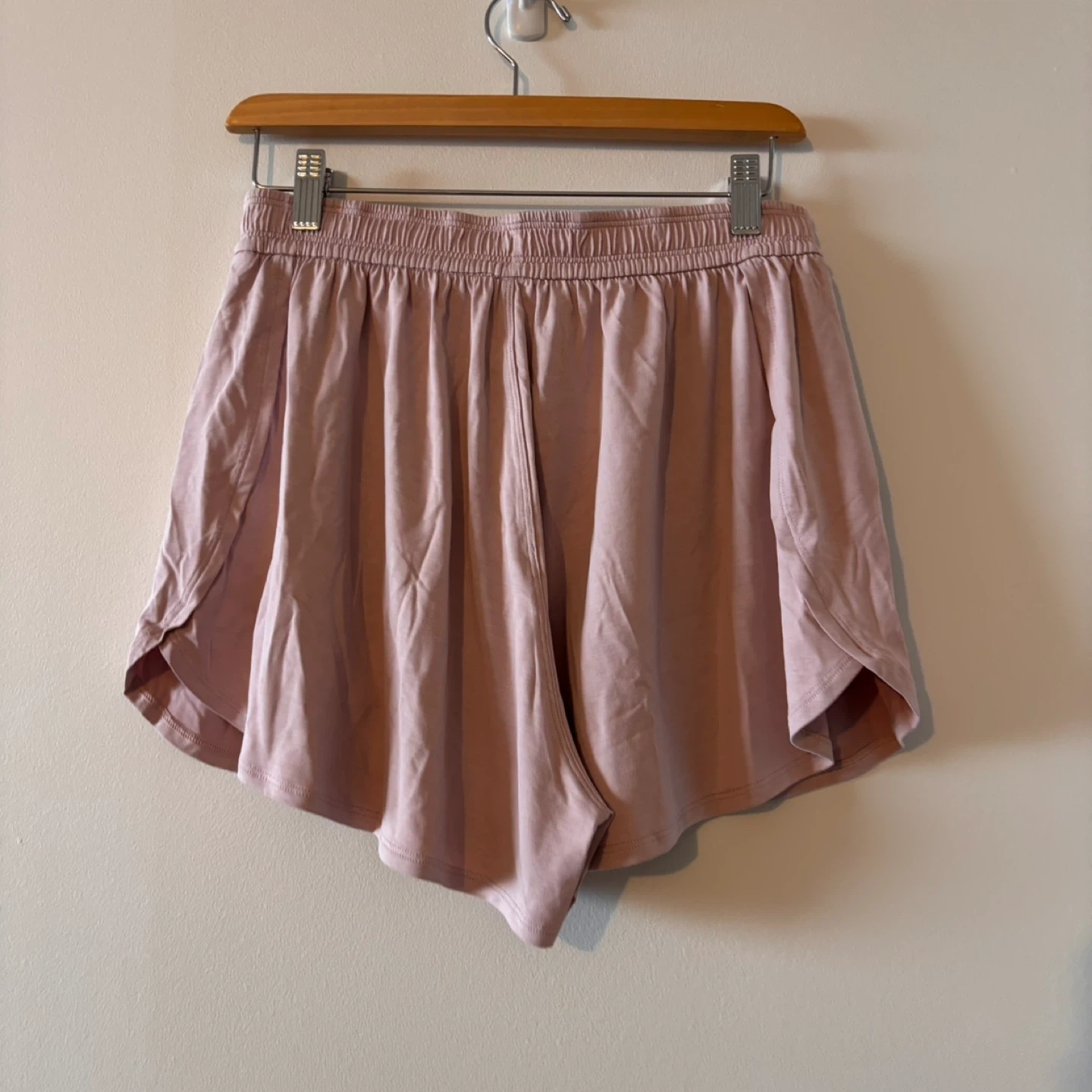 Light pink athletic shorts with a drawstring waist and pockets. Comfortable for workouts or casual wear. They're a size medium.