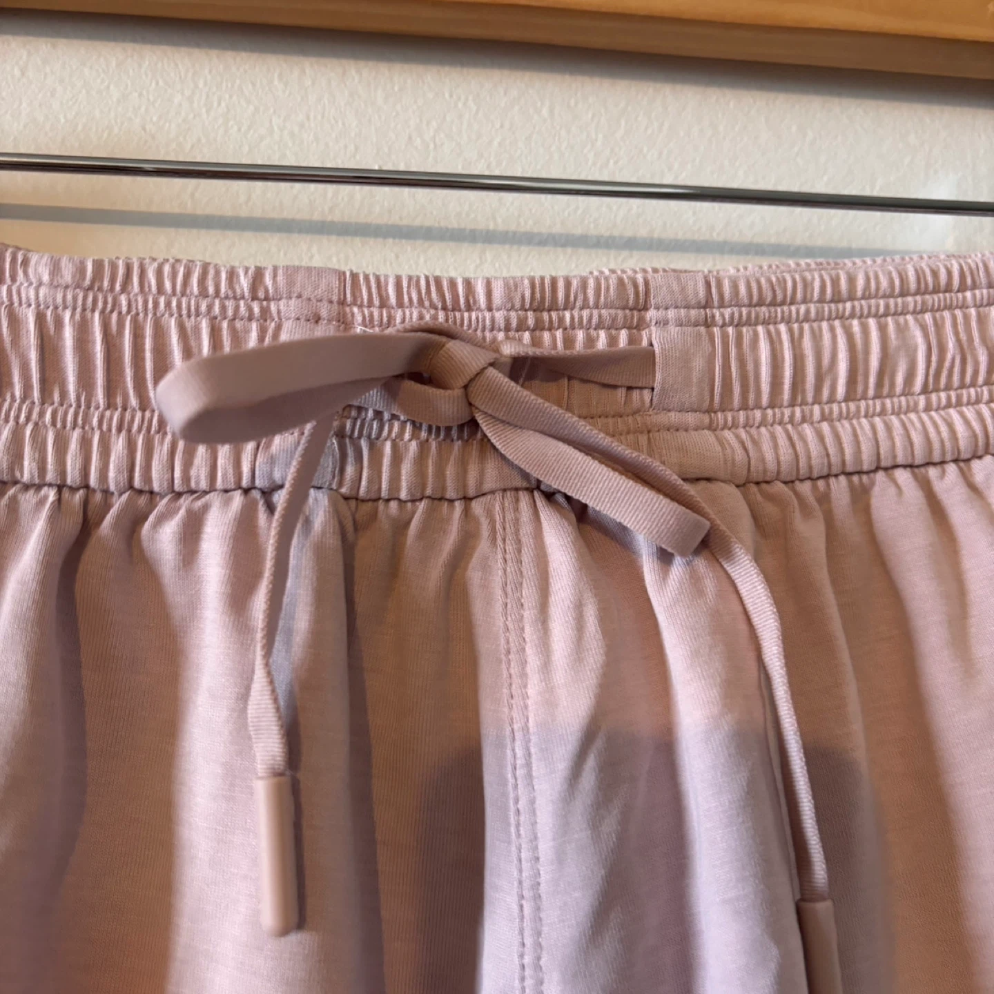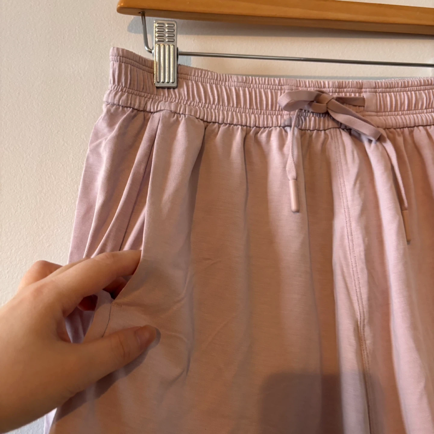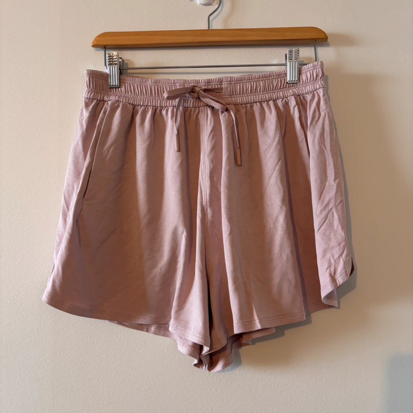 Light pink athletic shorts with a drawstring waist and pockets. Comfortable for workouts or casual wear. They're a size medium.