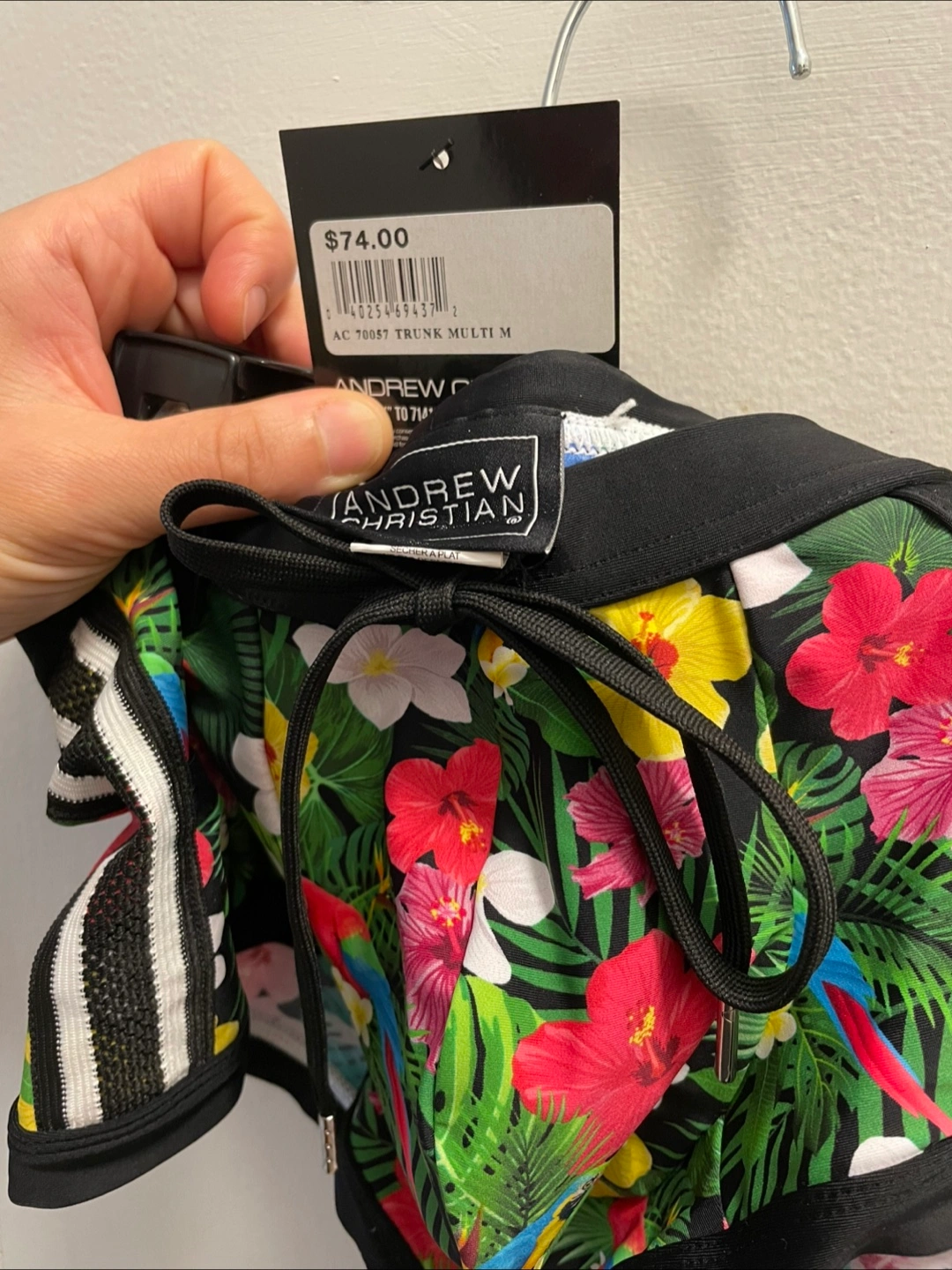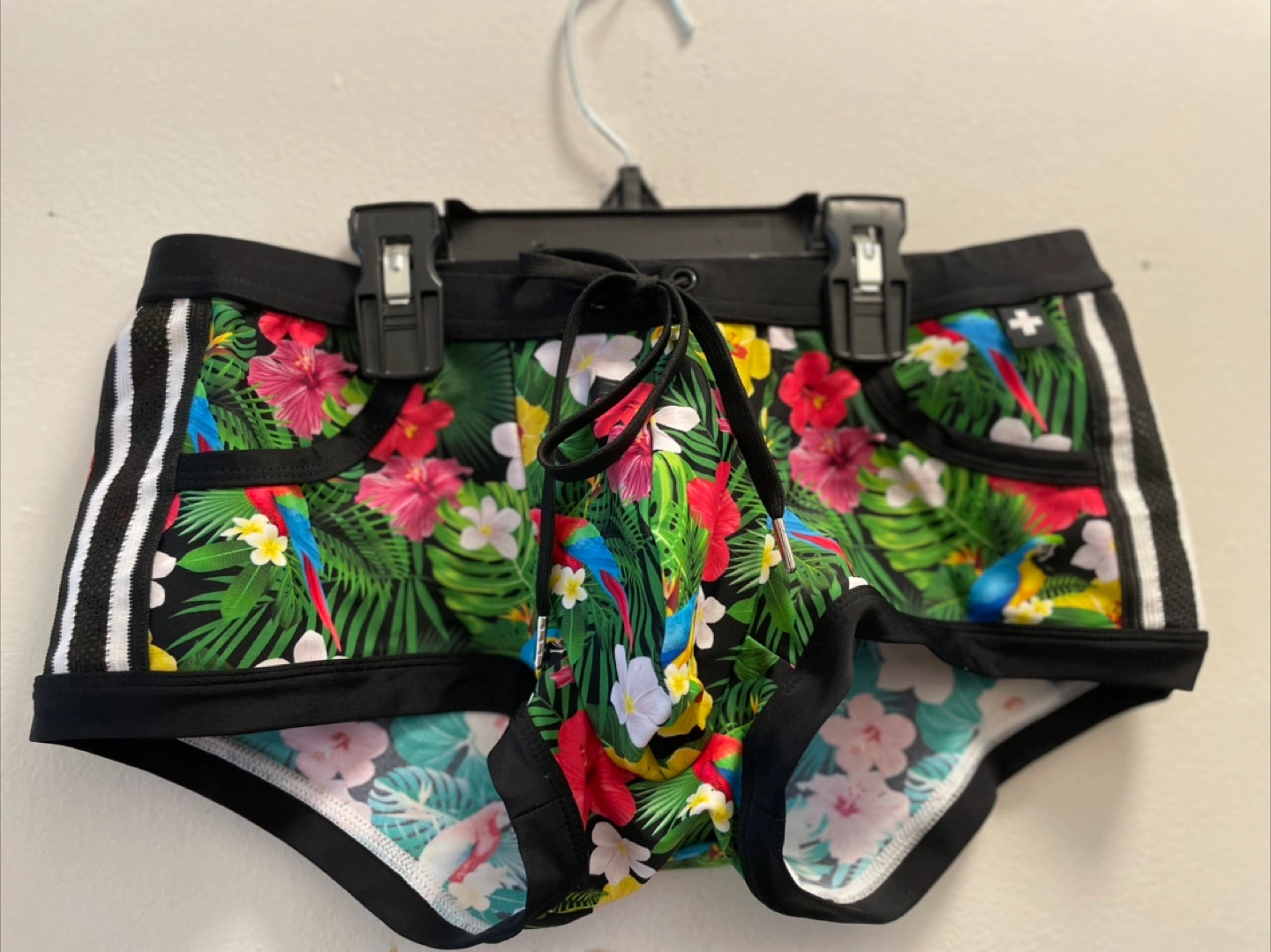 Andrew Christian men's swim trunks. Size medium. Tropical print. Black with colourful flowers and birds. Mesh side panels. Drawstring waist. Worn only once. Beautiful but too “dicky” and I want another pair of Addicted instead.