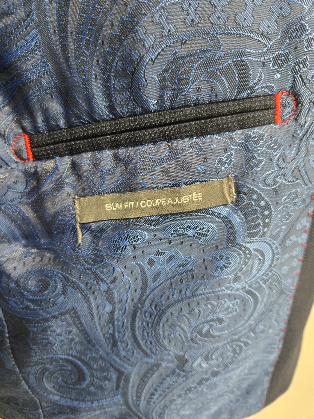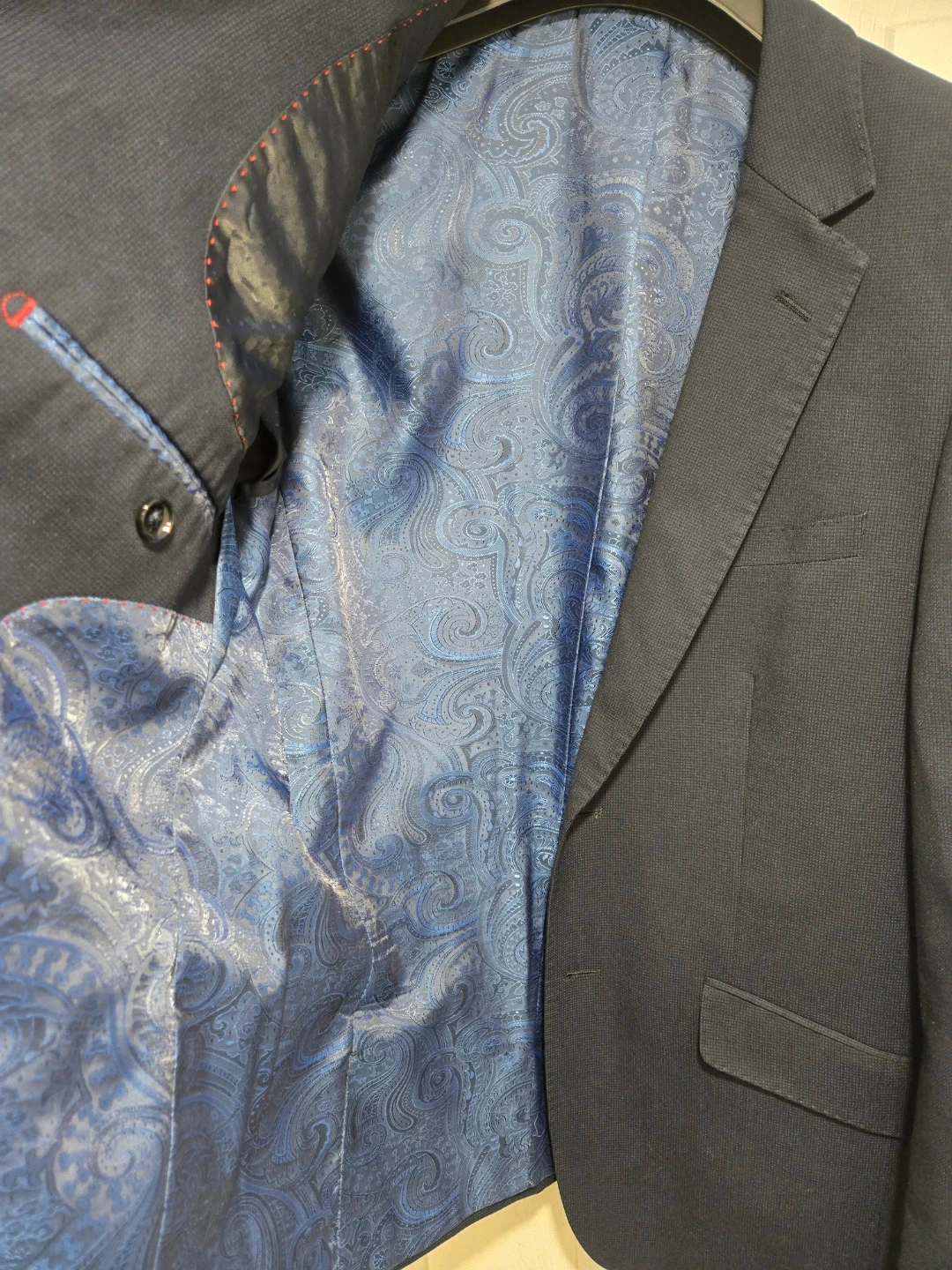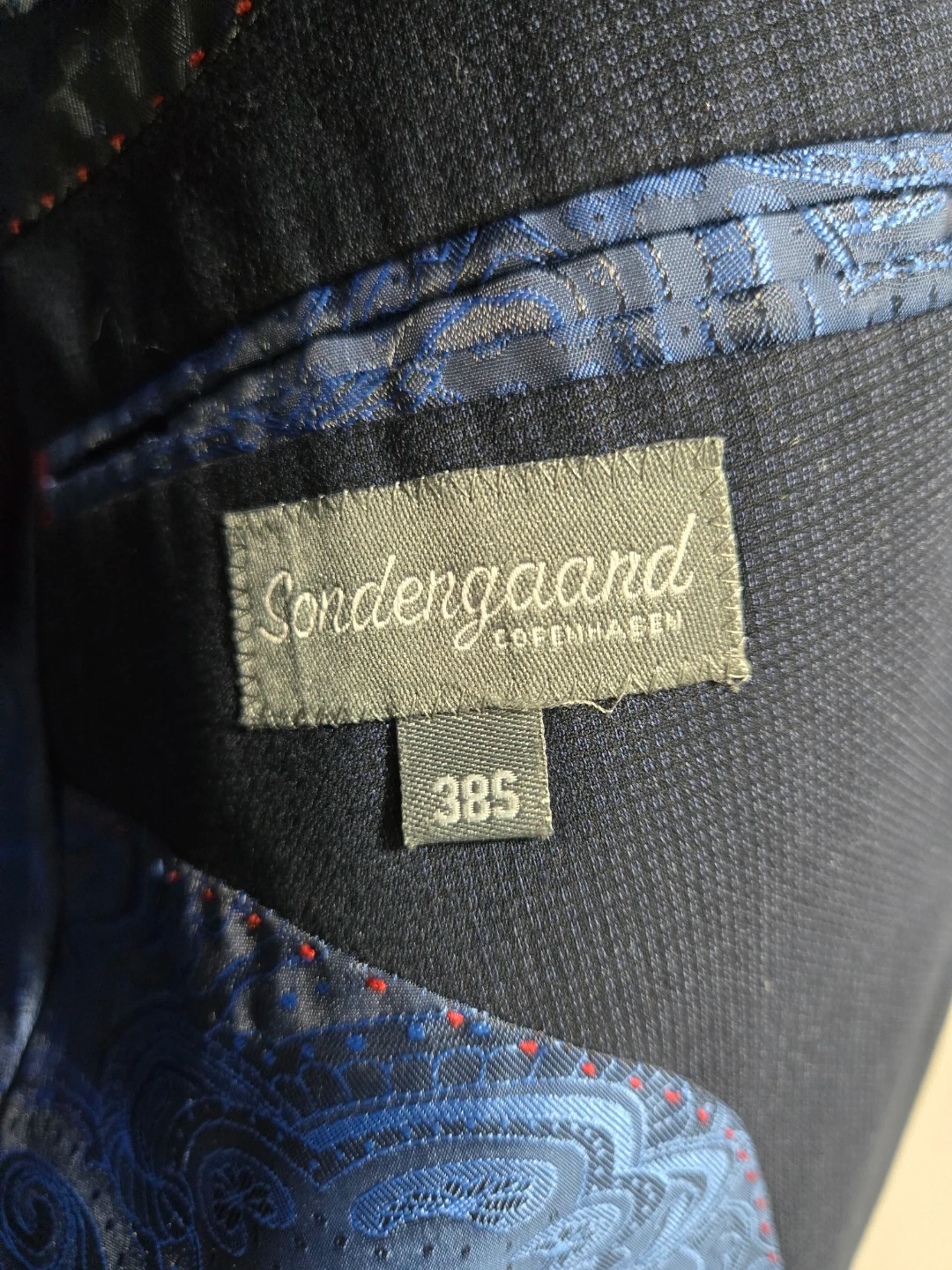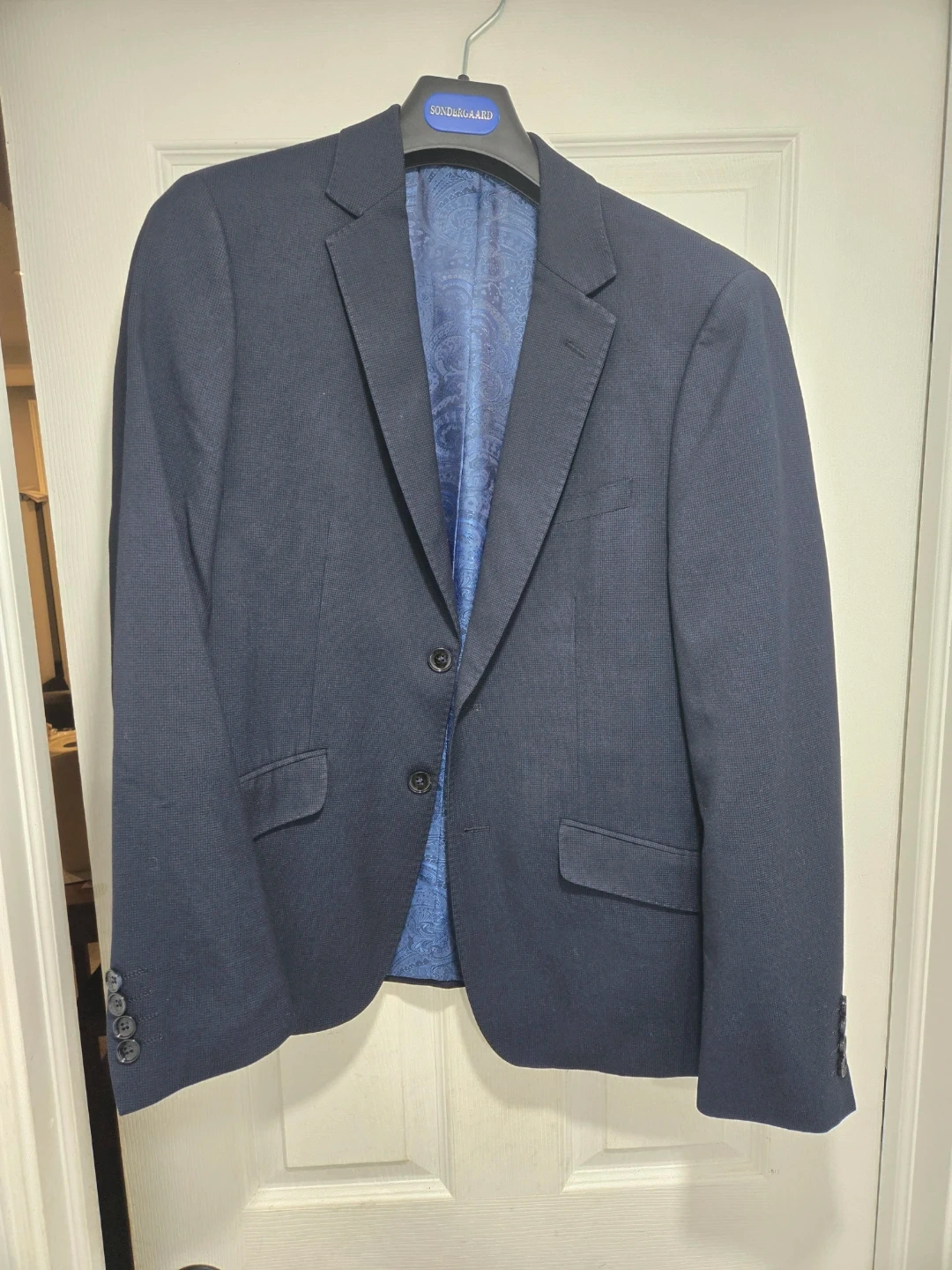 Navy blue blazer from Søndengaard Copenhagen. It's a slim fit with a bold blue paisley-patterned lining. Features two-button closure and classic notch lapels.