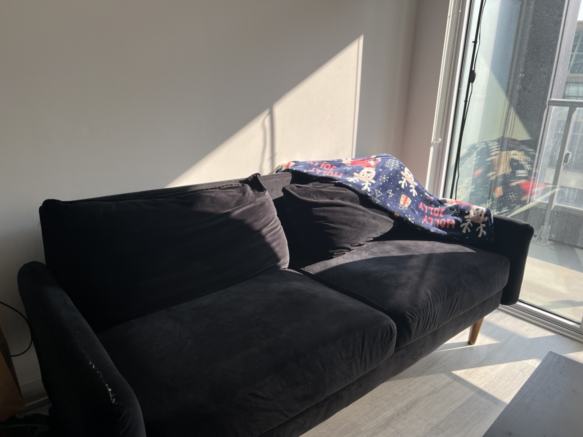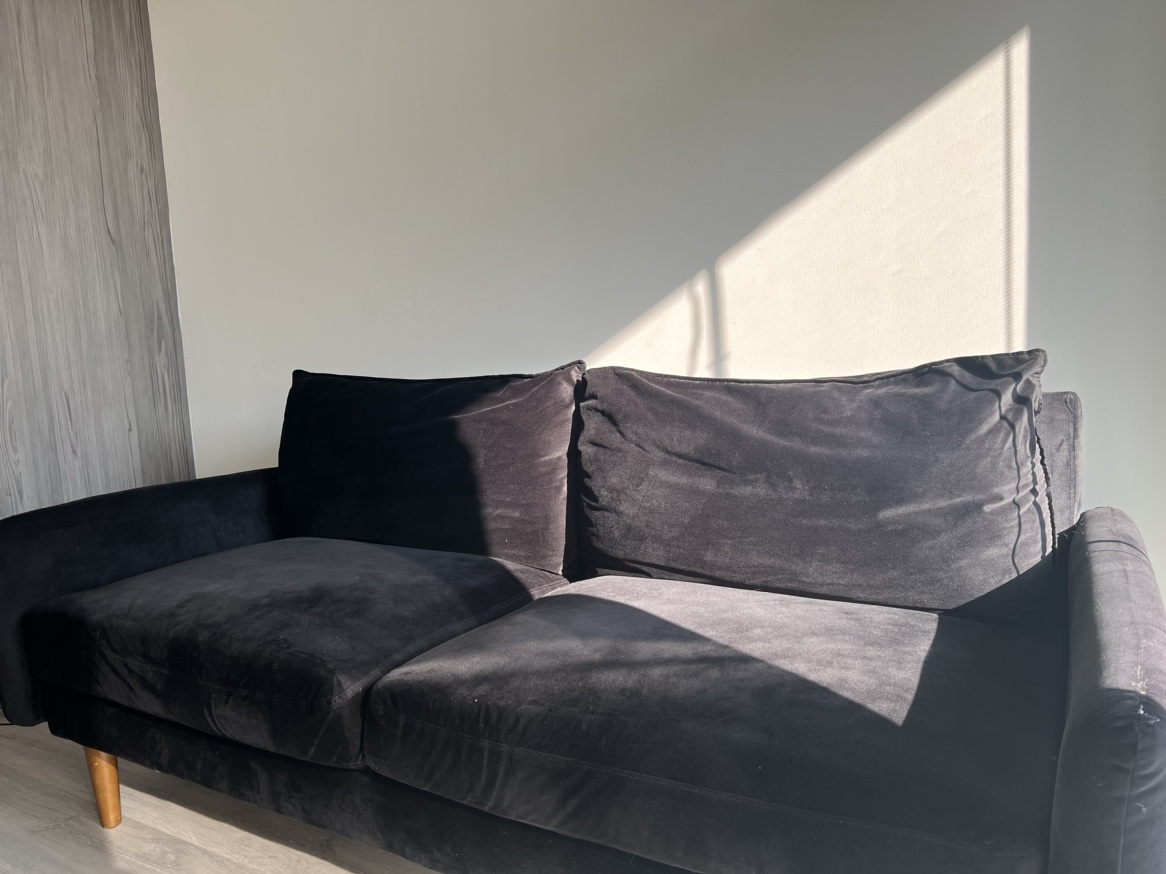 Pre-loved black velvet sofa (three seater) in great condition. It comes apart so it is really easy to move with a SUV. Condition as pictured (only minor wear). It is very chique and elevates any space; easy to decorate with pillows as well because of the dark background.