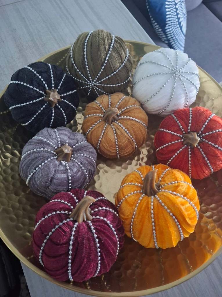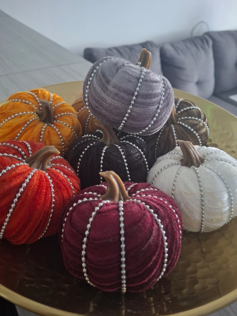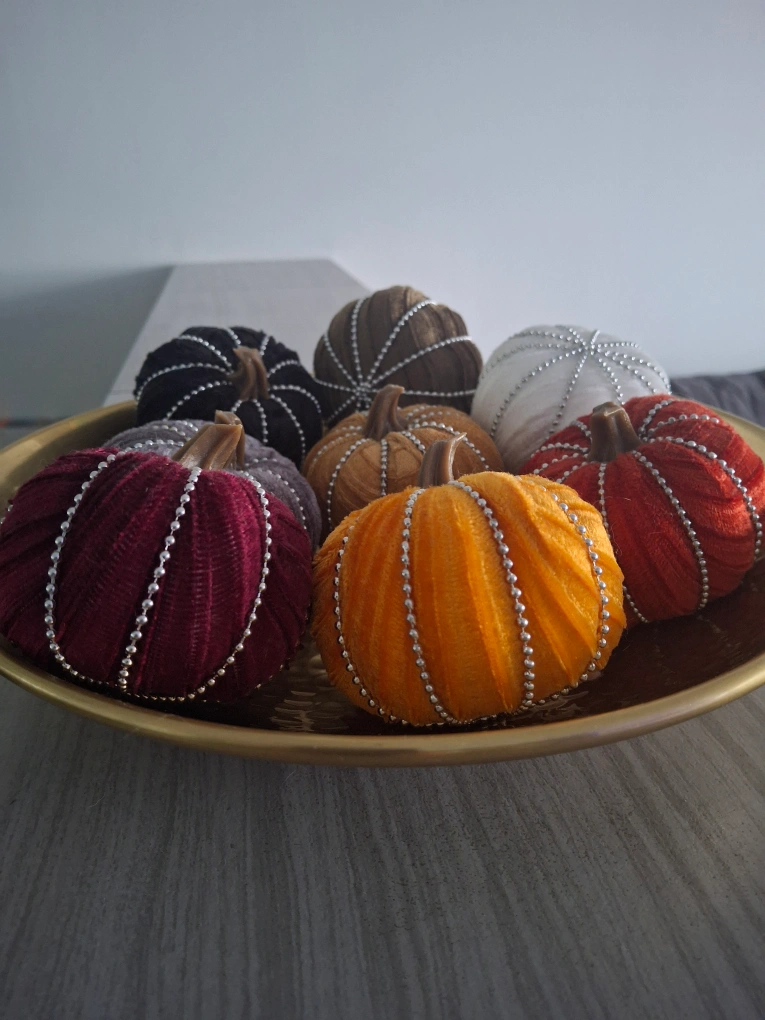 Spruce up your autumn decor with these adorable velvet pumpkins! They come in a variety of colours, including orange, red, white, black, brown, purple, and burgundy. Each pumpkin is accented with delicate beaded details, adding a touch of elegance to your fall display