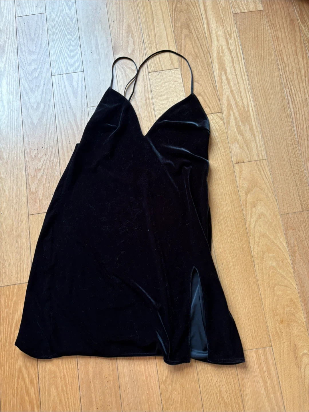 Selling a cute velvet mini dress in black! It's a simple slip dress style with spaghetti straps and a slit on one side. Perfect for a night out or a special occasion